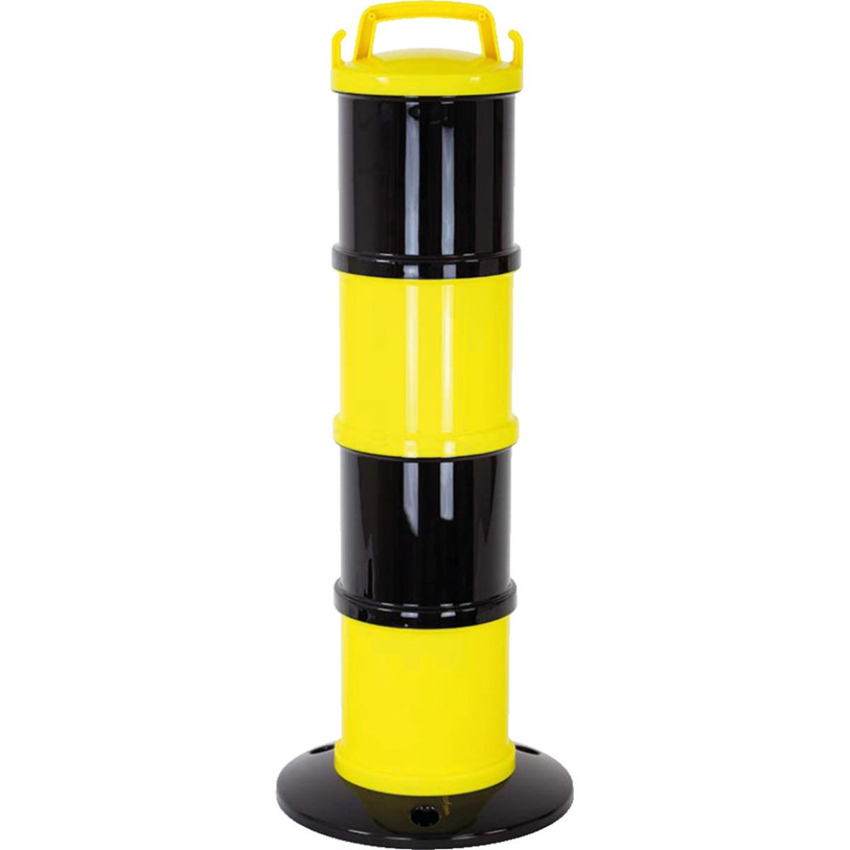 Der modulare Absperrpfosten kann befüllt oder fest installiert werden. Er besteht aus Sockel, vier Segmenten, Abdeckung, 5 m Kette sowie Montageschraube und Stab für einfachen Auf- und Abbau – flexibel für diverse Absperranwendungen.
