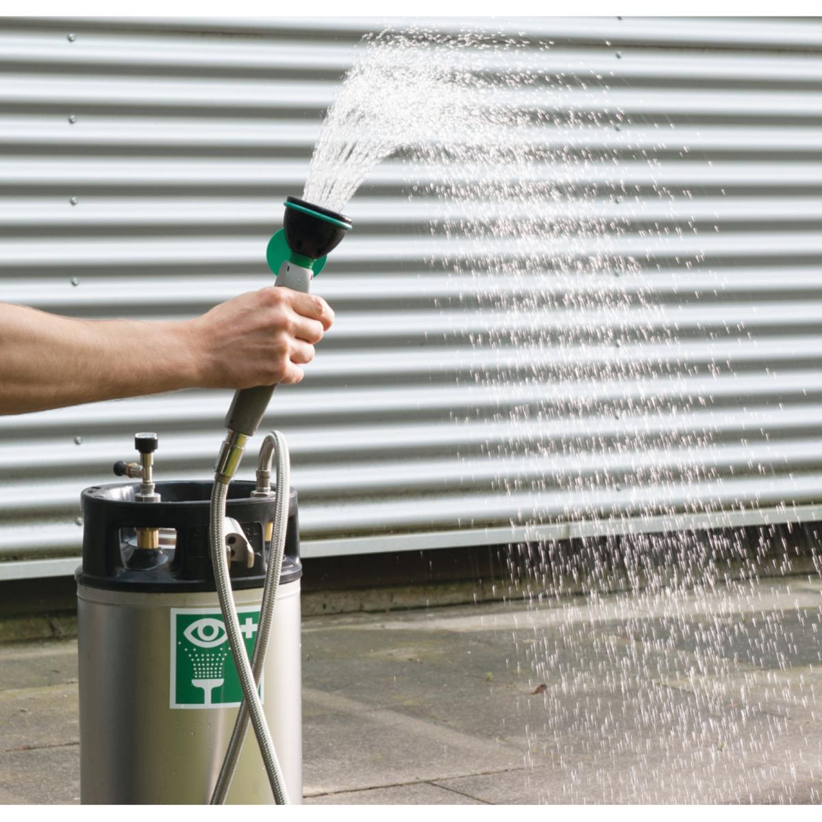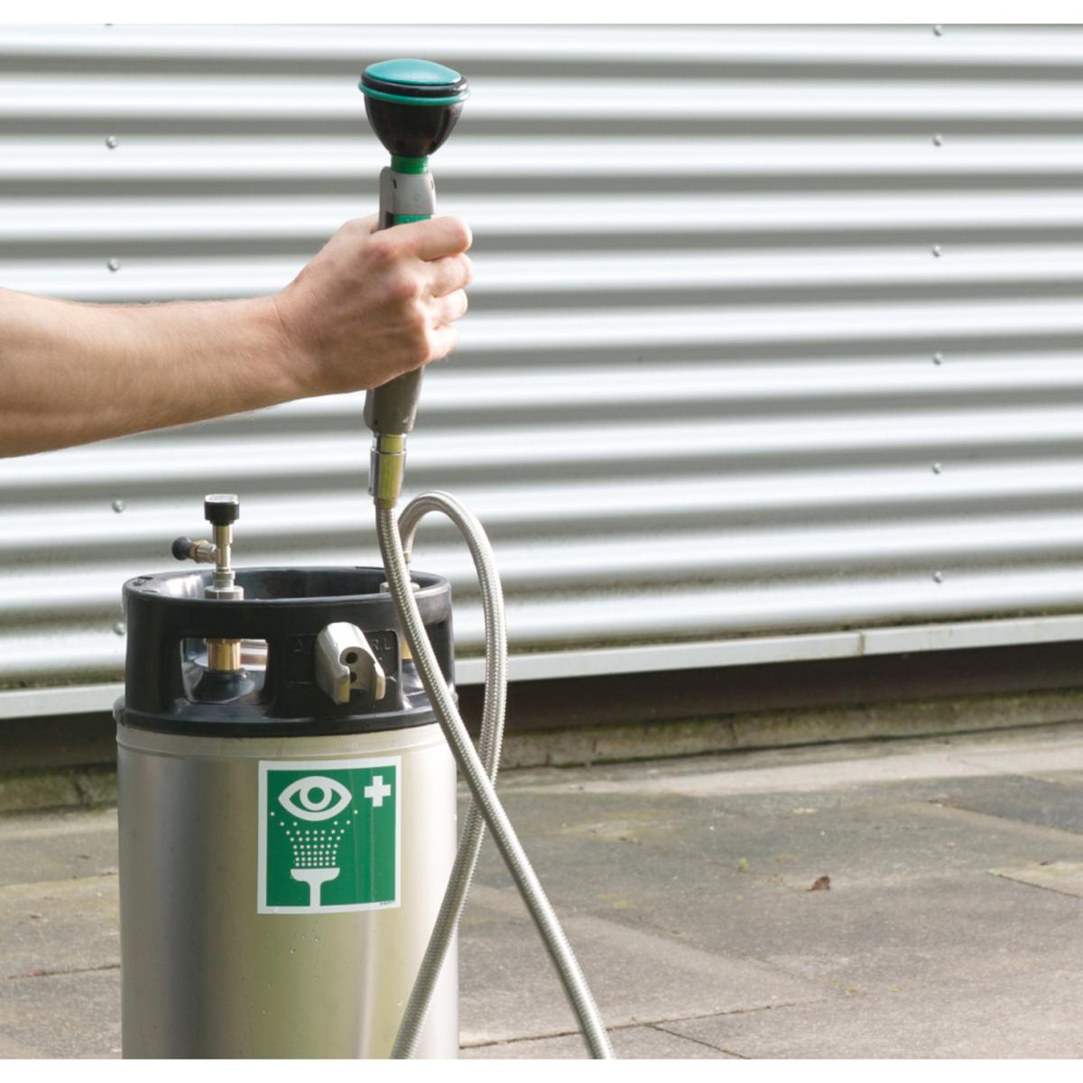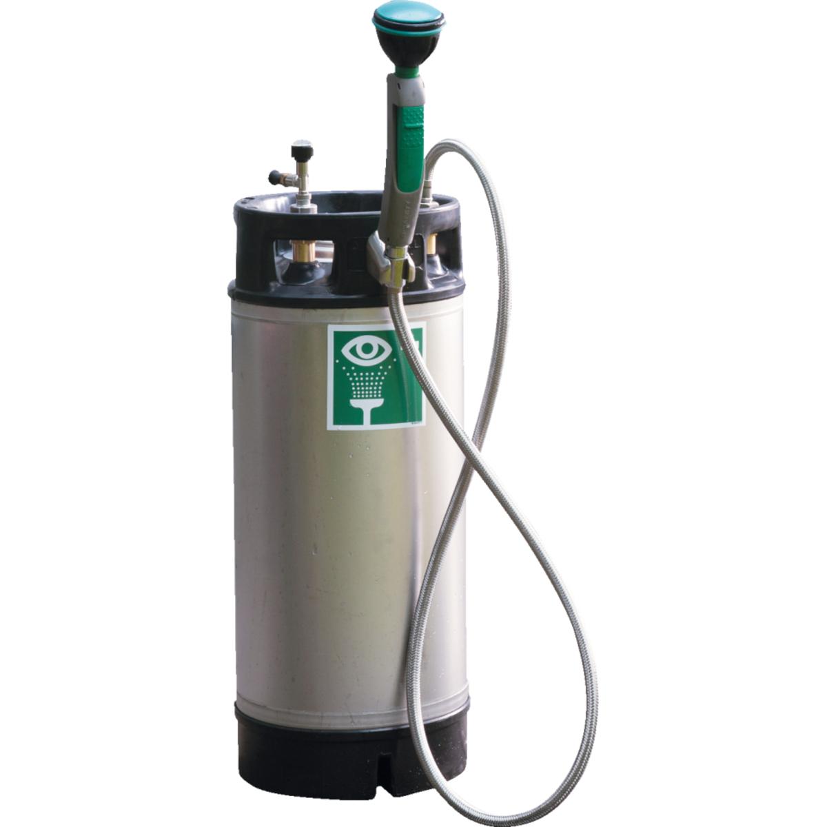 Mobile druckluftbetriebene Augendusche mit Edelstahltank. Ermöglicht 2 Minuten kontinuierliche Augenspülung unabhängig von der Wasserversorgung.