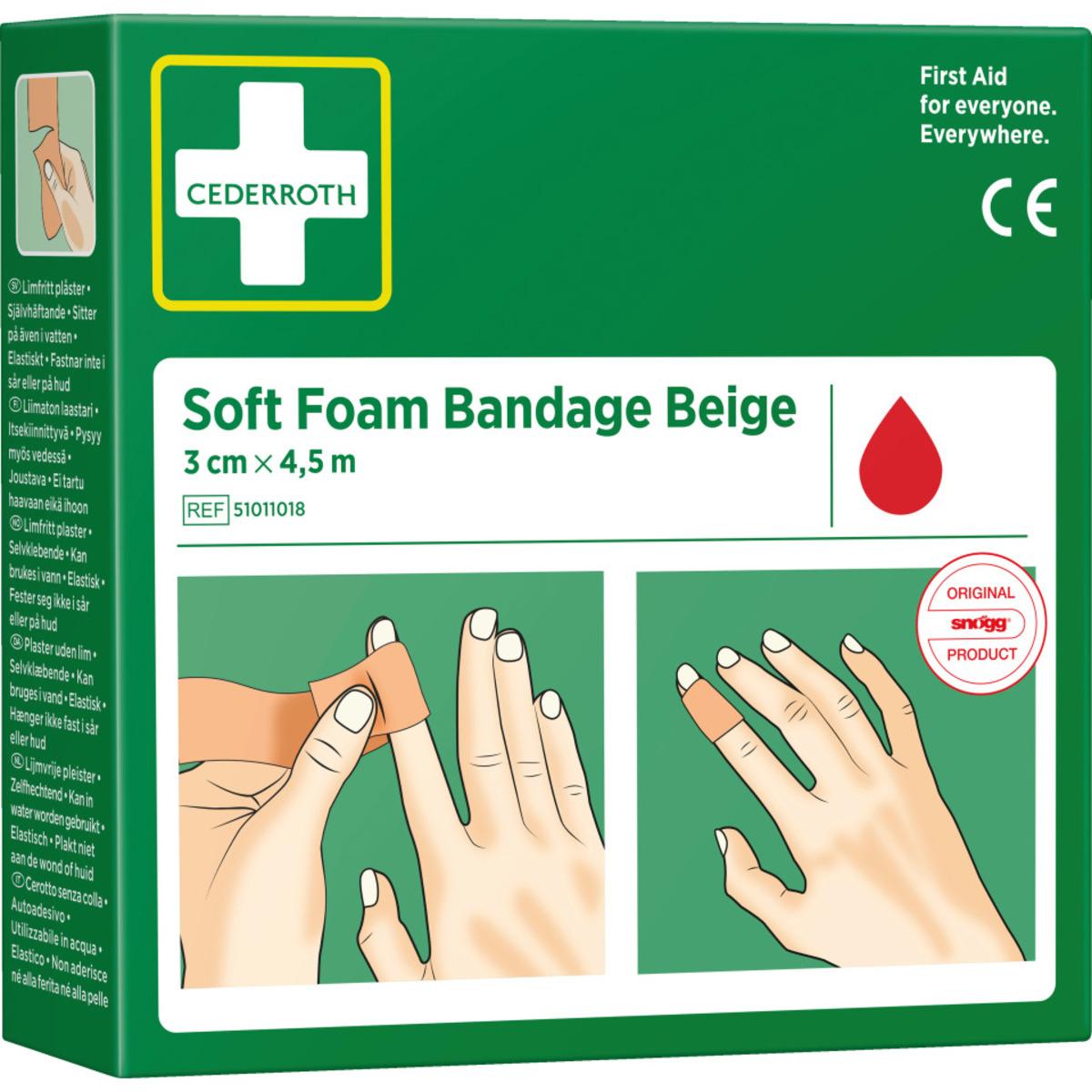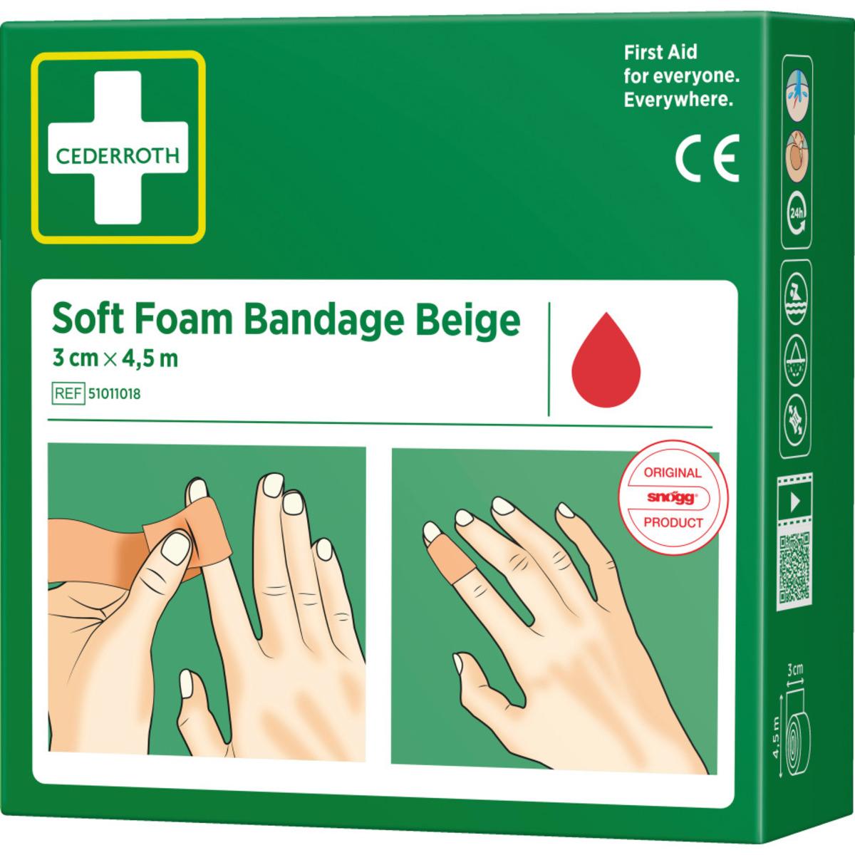 Elastische, selbstklebende CEDERROTH Soft Foam Bandage zum Einsatz auf kleineren Wunden. Hautfreundlich und atumungsaktiv, haftet nicht auf der Wunde oder Haut. Verliert auch im Wasser seine Hafteigenschaften nicht, kann auch zusammen mit Salben oder Cremes verwendet werden. Zum einmaligen Gebrauch.