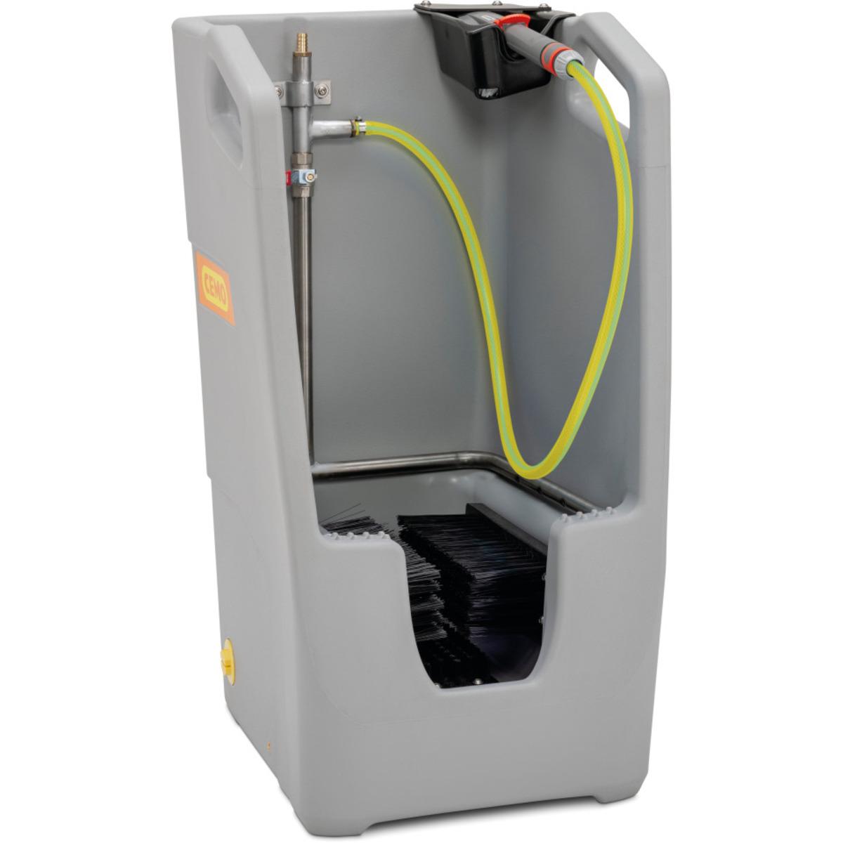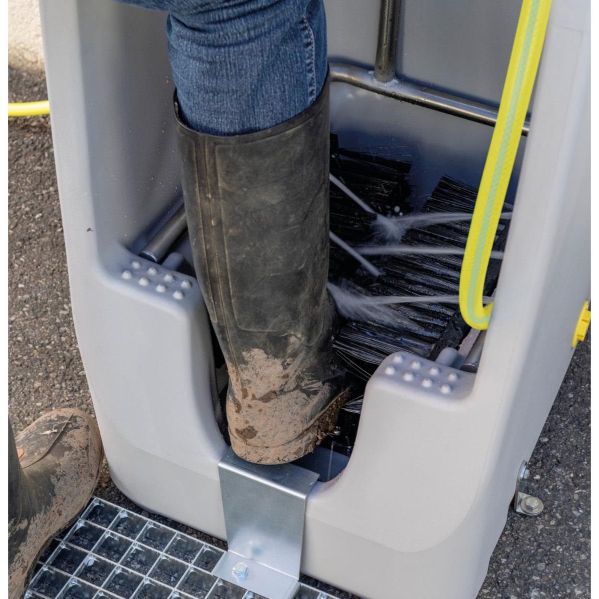 Stiefelreiniger für den anspruchsvollen Einsatz. Ausgestattet mit drei festen und beweglichen Bürsten, Leitungen aus Edelstahl, Bürstenhalter mit integrierter Handwaschfunktion und einer intergrierten Sammelwanne zum Sammeln und Ableiten des ablaufenden Schmutzwassers.