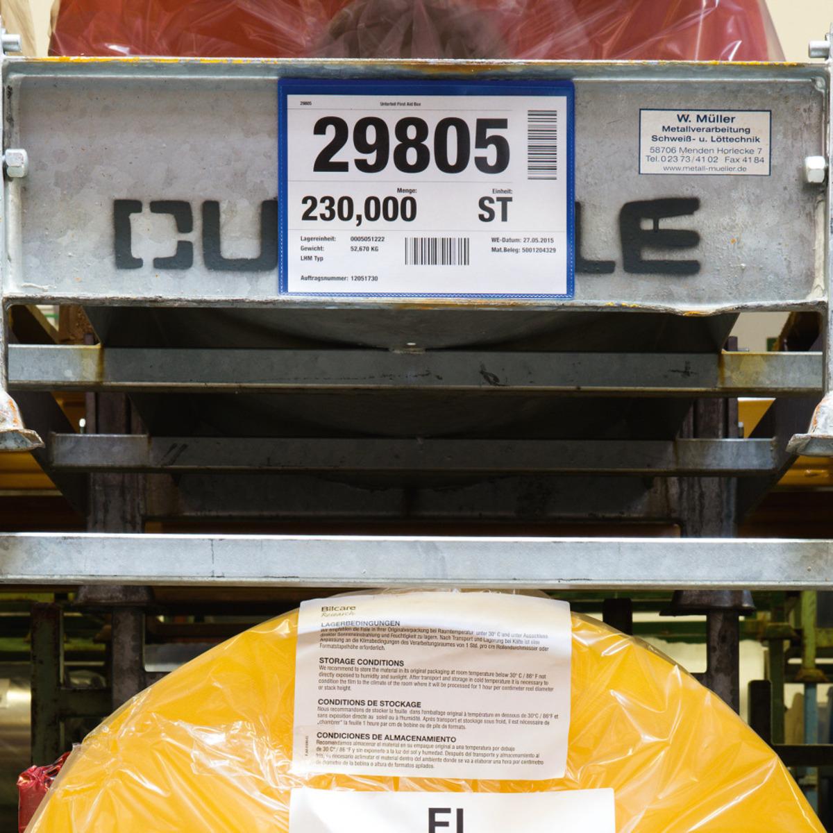 Scannertaugliche Kennzeichnungstasche mit zwei rückseitigen Magnetstreifen zur Befestigung an metallischen Oberflächen wie z.B. Lagerregale, Lochblechwände, Metallbehälter und CAN-BAN Behälter.