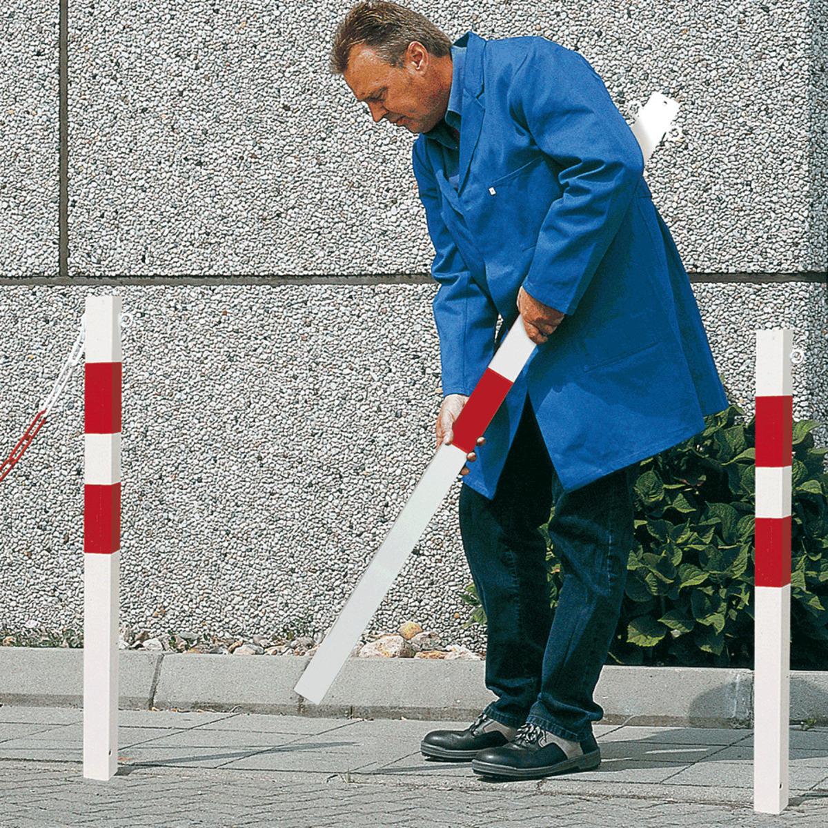 Auswahl: K.57 Absperrpfosten Bern, 2 Kettenösen, Einbeton., rot/reflekt.-weiß, 70x70mm, 1400mm