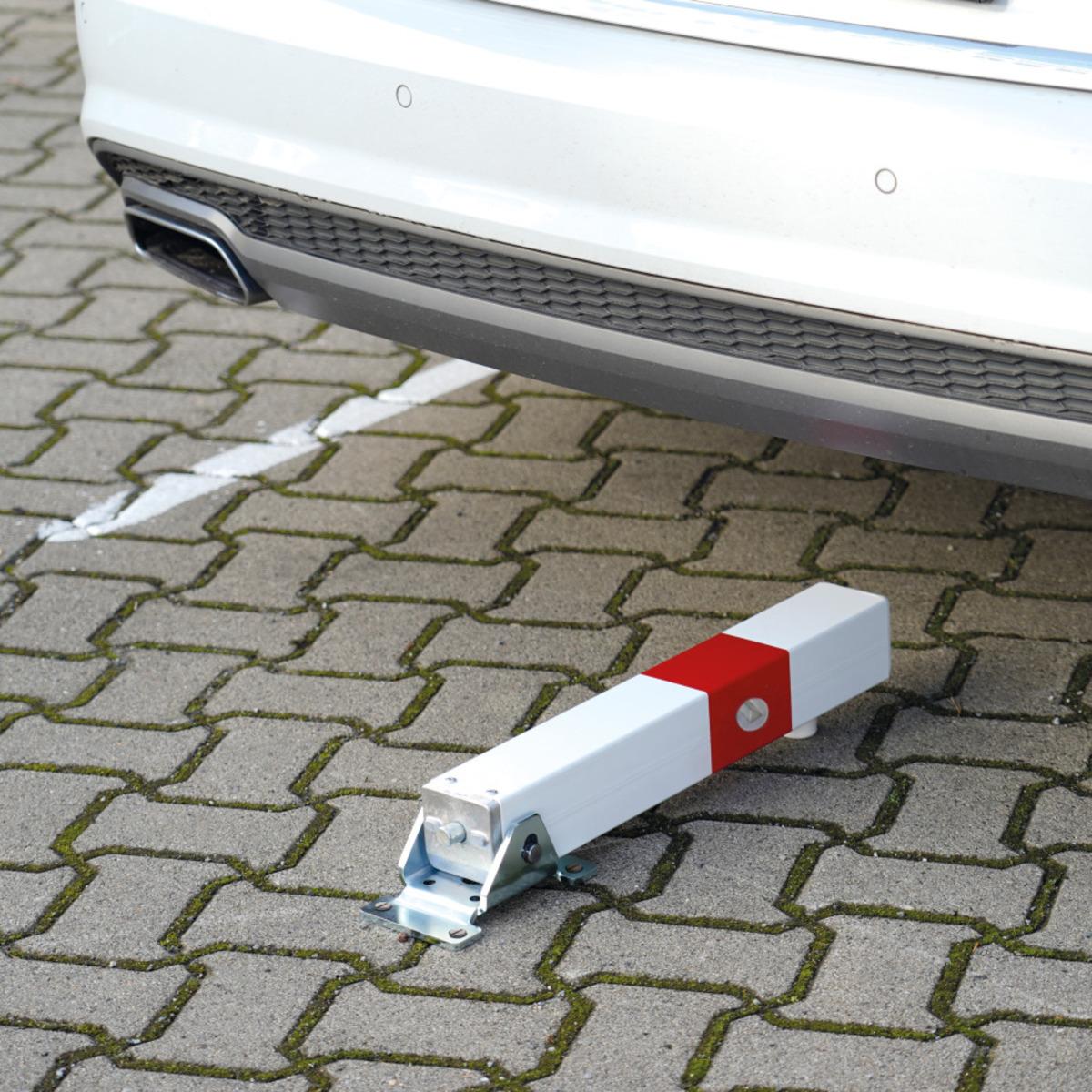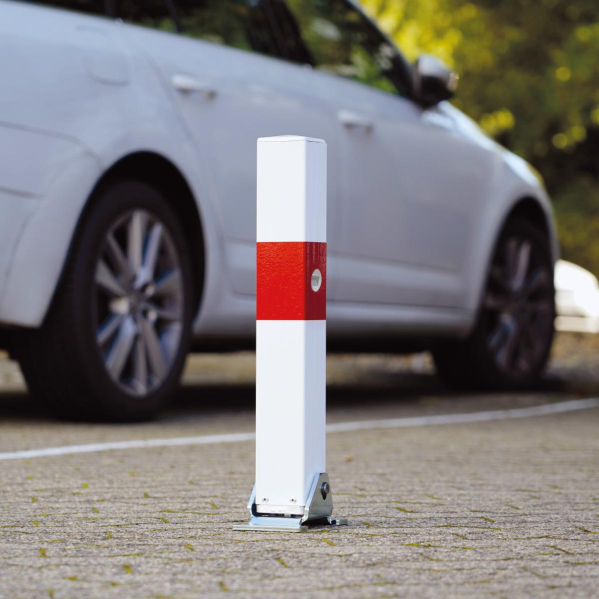 Umklappbarer Absperrpfosten Rom Mini zum Sperren von Ein- und Ausfahrten, Parkplätzen oder Privatwegen, roter Reflexstreifen für gute Sichtbarkeit auch im Dunkeln, Auflage mit Gummipuffer