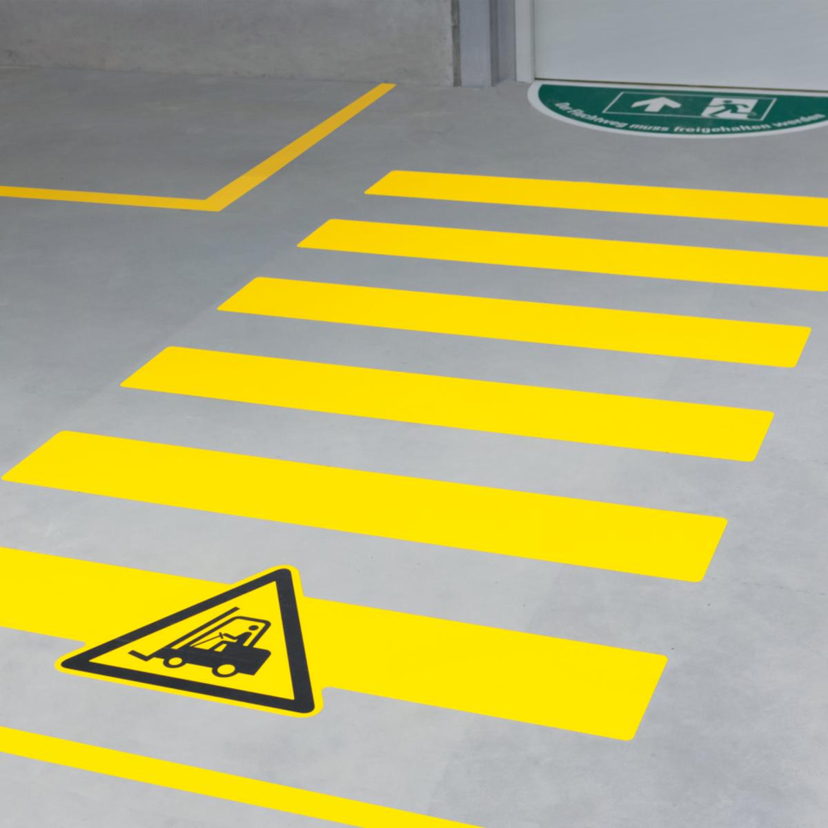 Selbstklebende Bodenmarkierung Zebrastreifen WT-7110 mit hohem Warn- und Hinweiseffekt für mehr Sicherheit von Fußgängern beim Überqueren von Verkehrswegen in Lager- oder Produktionshallen, extrem verschleißfest und mit Flurförderzeugen befahrbar, geeignet für glatte Böden im Innenbereich
