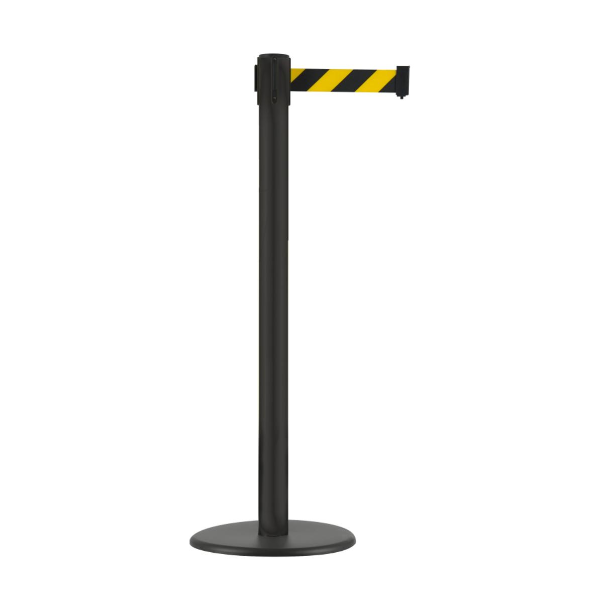 Leichter Gurt-Absperrpfosten Kunststoff zum schnellen Absperren oder Leiten von Besuchern, stabiler, gusseiserner Bodenteller, stufenlos ausziehbarer Gewebegurt mit Aufrollautomatik, Auszugslänge bis zu 4 Meter, innen und außen einsetzbar