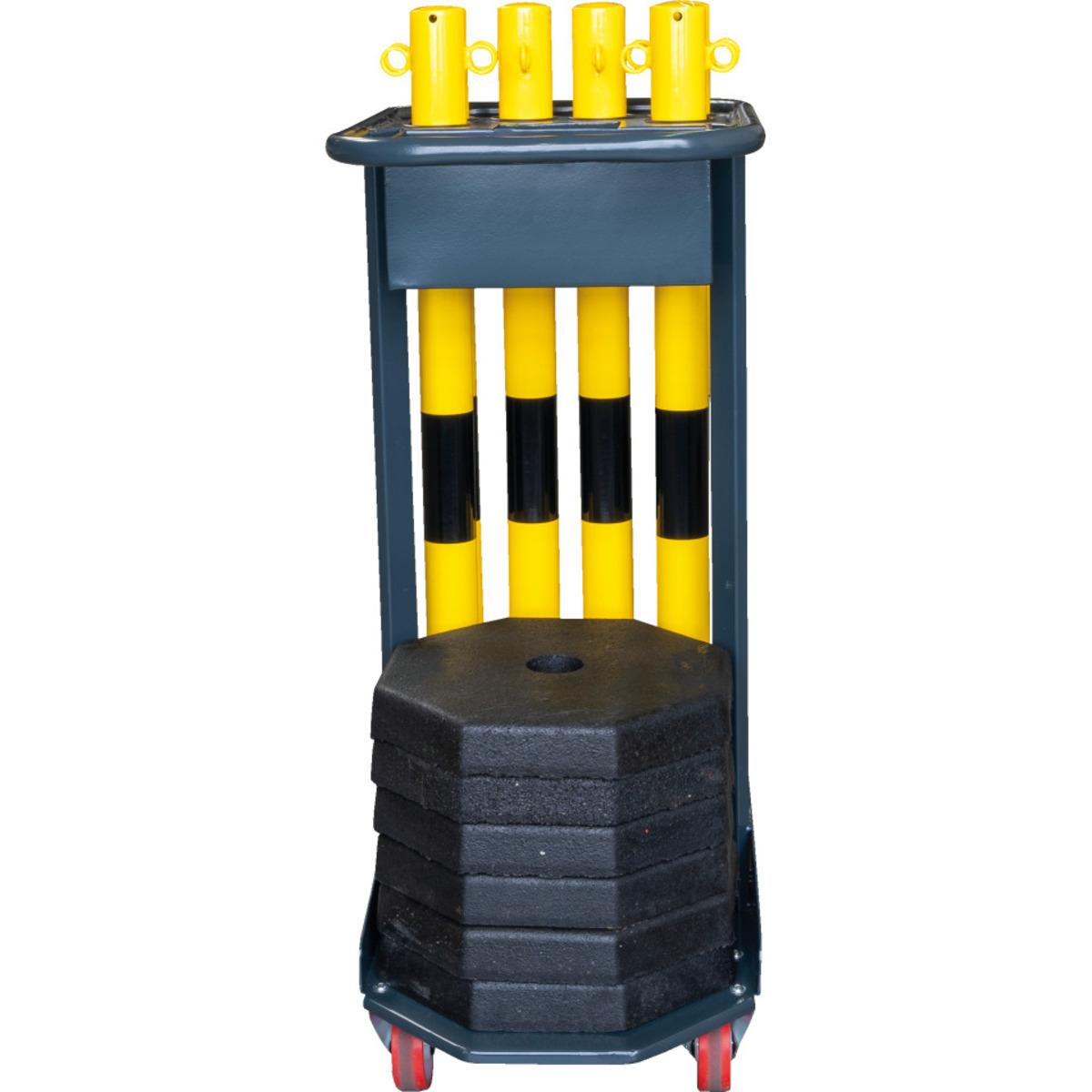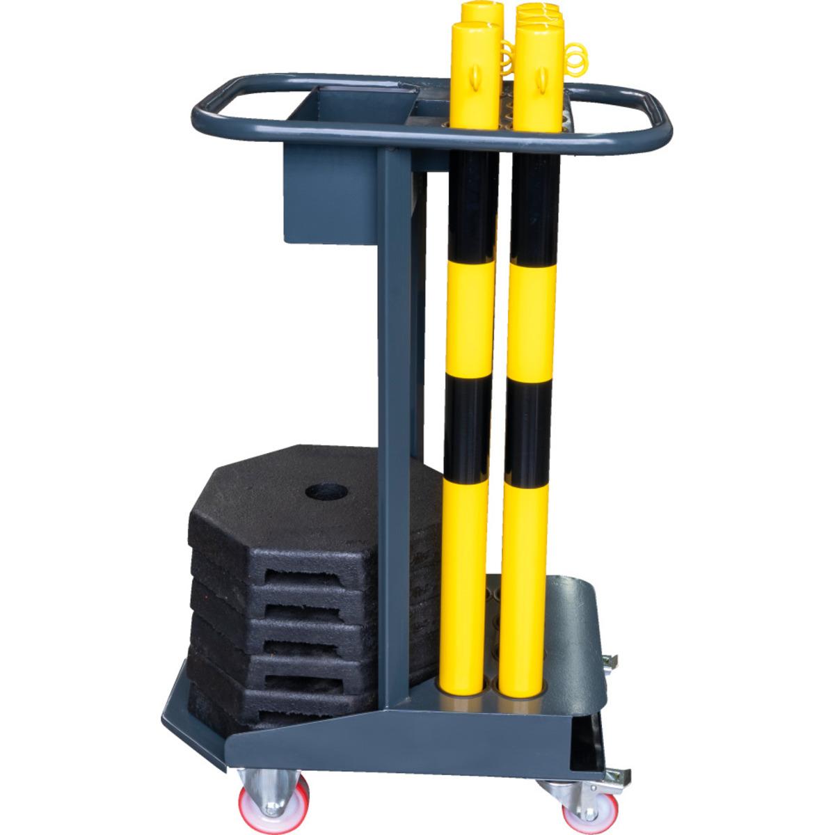 Kettenständer-Set Poly zum Einrichten von Absperrungen im Innen- oder Außenbereich, besonders leicht und schnell aufzubauen, abnehmbare Füße. Inklusive Caddie mit praktischem Rundumgriff, gummierten Rollen für geräuscharmes Gleiten und materialschonenden Gummieinlagen in den Sammelfächern, speziell für den Transport kompletter Absperrsysteme entwickelt.