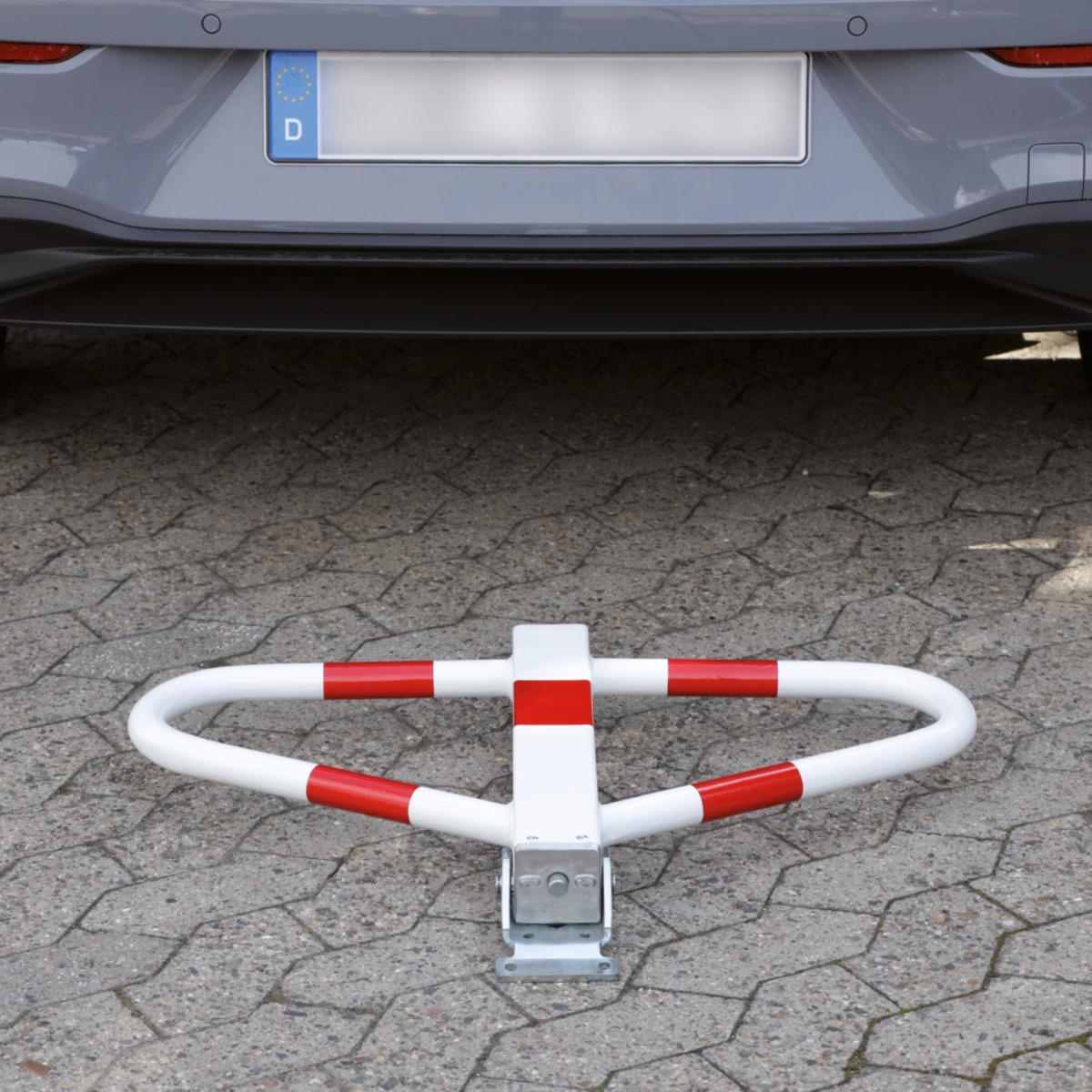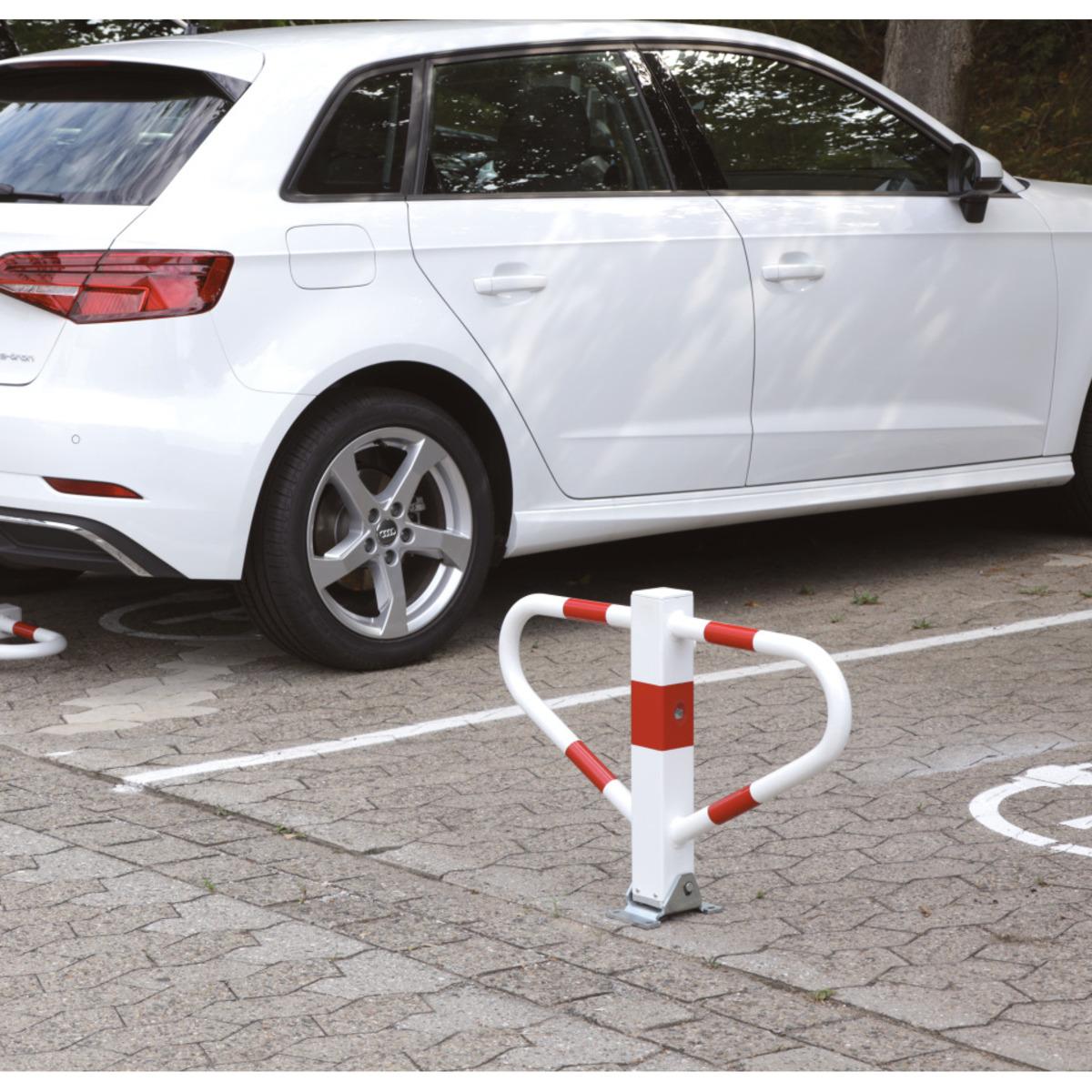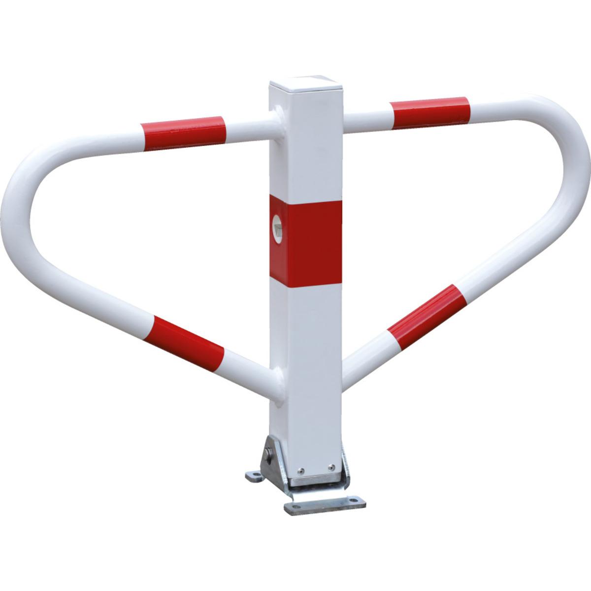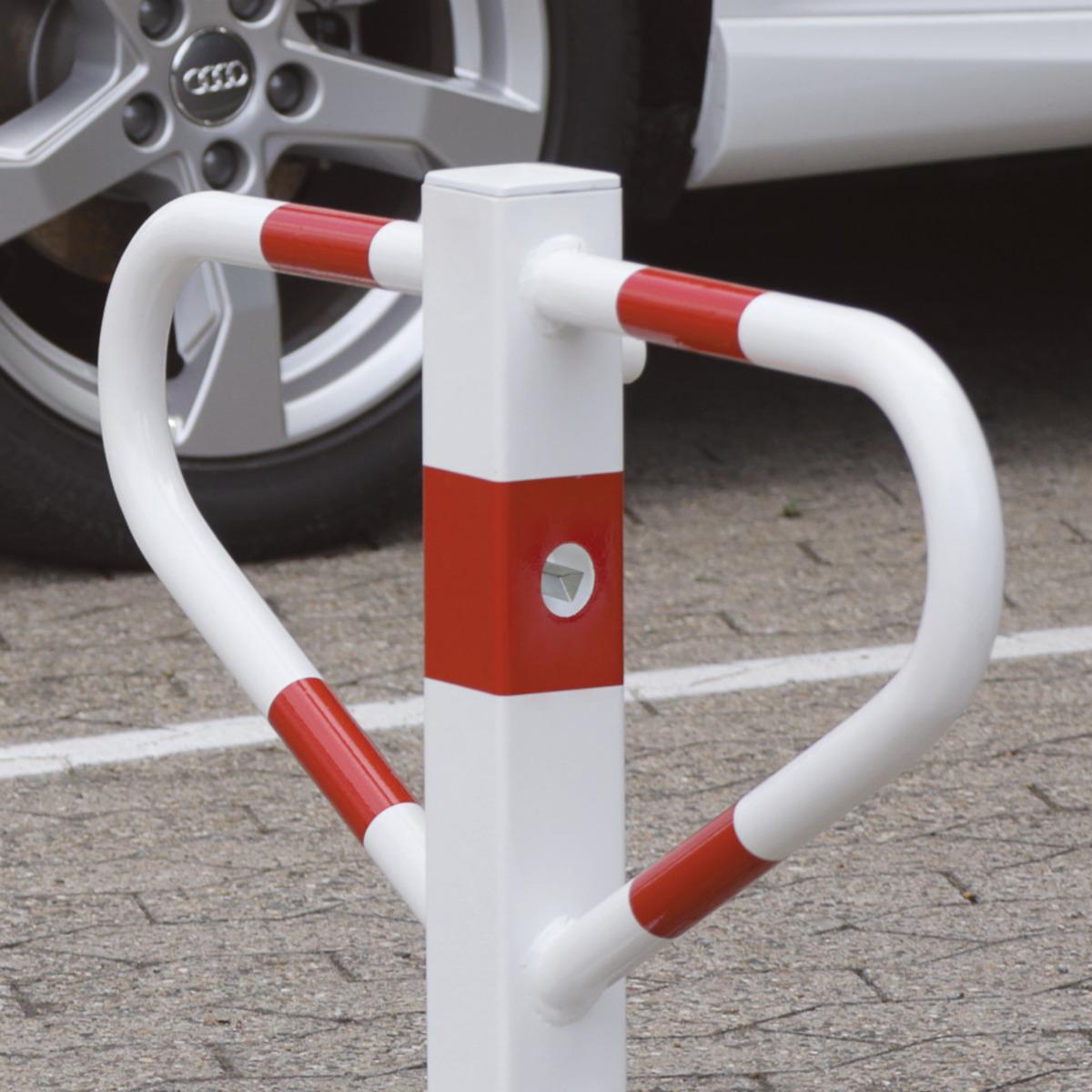 Parkbügel Rom zum Sperren von Einfahrten, Parkplätzen oder Privatwegen, abschließbar, Überfahrhöhe 80 mm, mit roten Reflexringen für mehr Sichtbarkeit auch im Dunkeln, zum Aufdübeln mit vorgebohrter Bodenplatte und Befestigungsmaterial