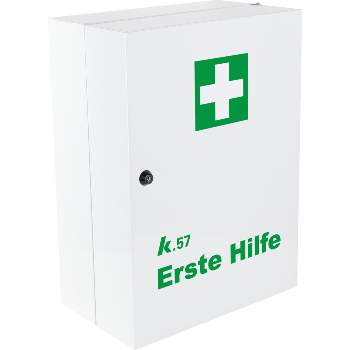 Abschließbarer Verbandschrank von K.57 zur Aufbewahrung von Erste-Hilfe-Material, 1-türig, zur festen Wandmontage.