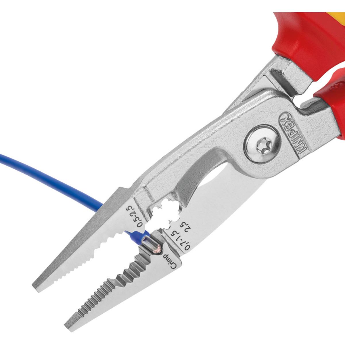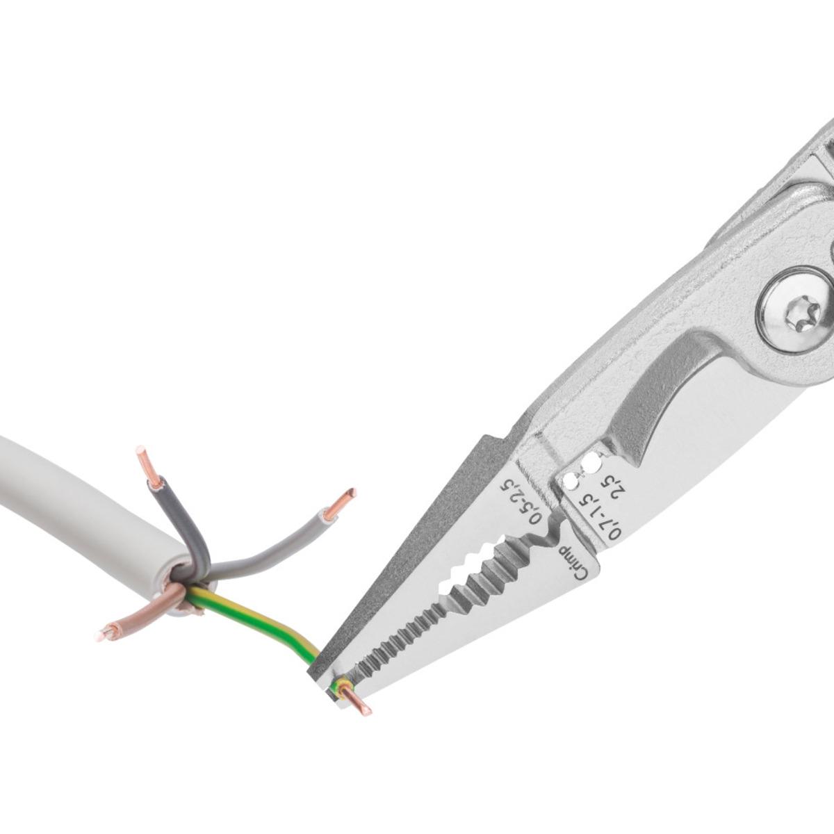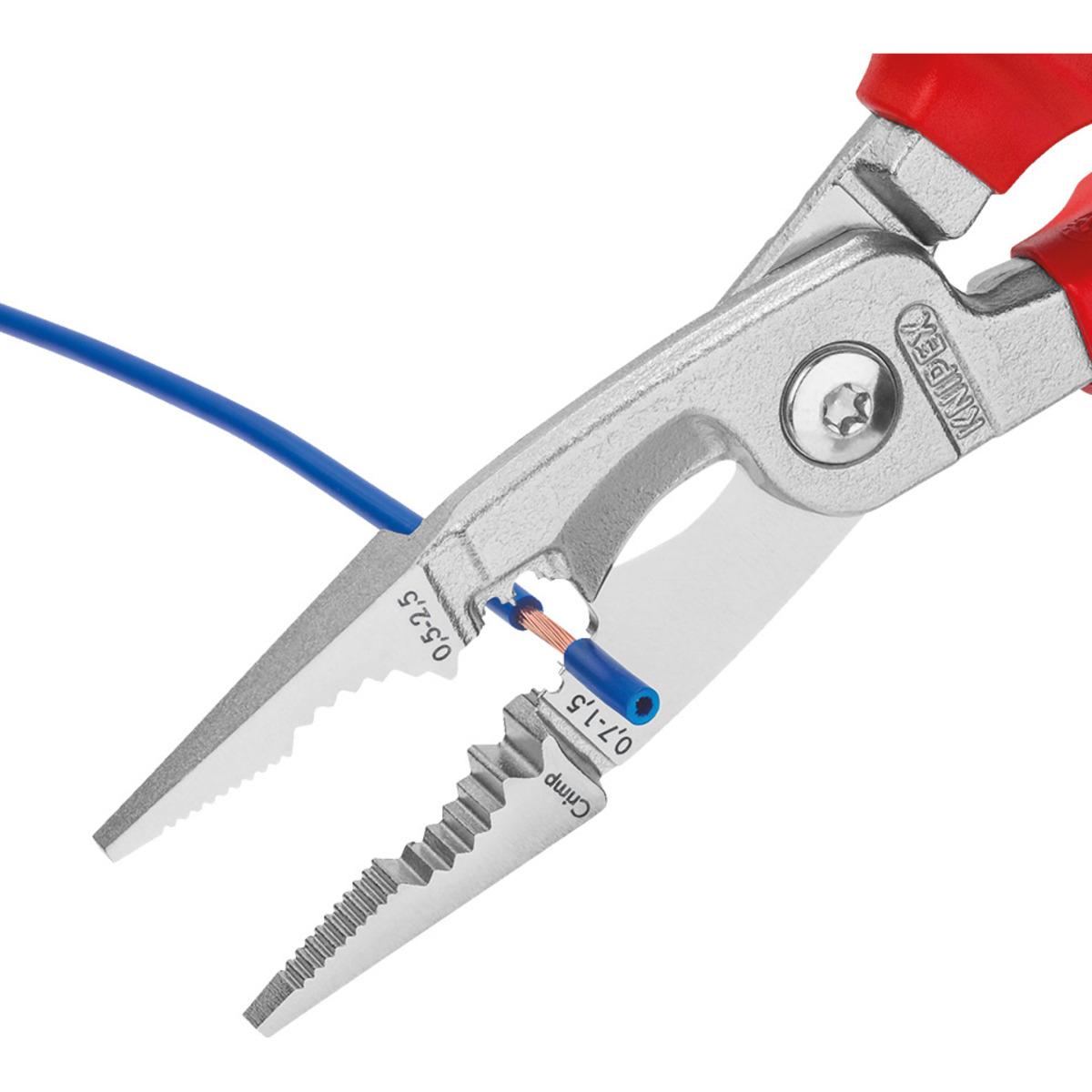KNIPEX® Elektro-Installationszange zum Greifen von Flach- und Rundmaterial, Biegen, Entgraten, Kabelschneiden, Abisolieren und Crimpen von Aderendhülsen.