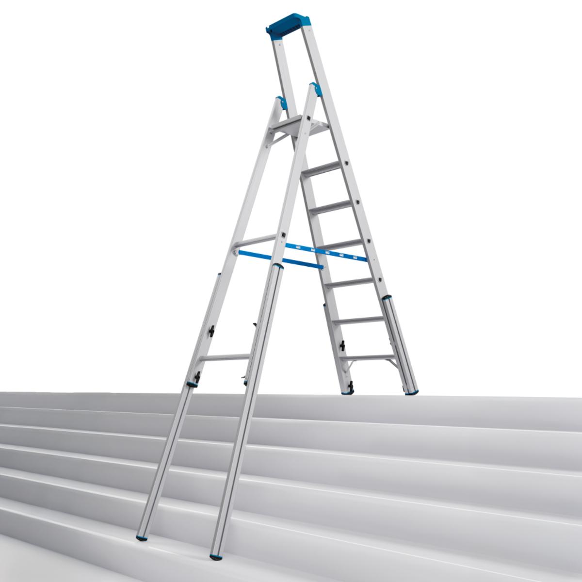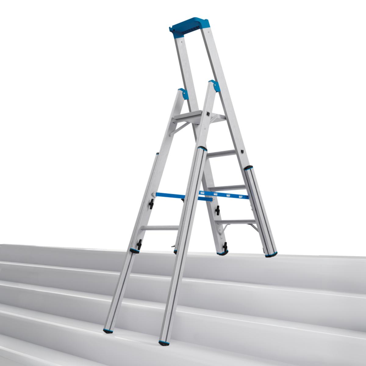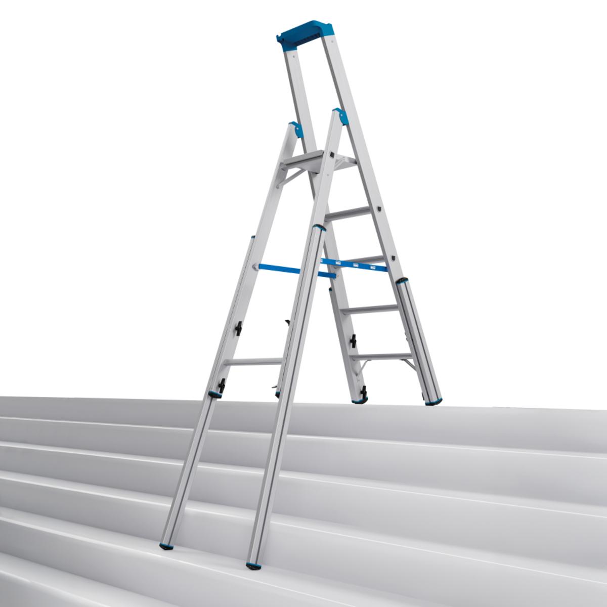 Robuste, einseitig begehbare Leiter mit hohem Sicherheitsbügel und praktischer Ablageschale. Stabile Metall-Gelenkverbindung mit Klemmschutz, große rutschhemmende Plattform und vier flexibel verstellbare Holmverlängerungen für sicheren Stand. Premium-D-Stufen und hochwertige Verarbeitung sorgen für langlebige Profi-Qualität.