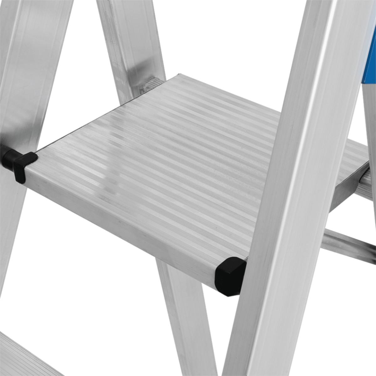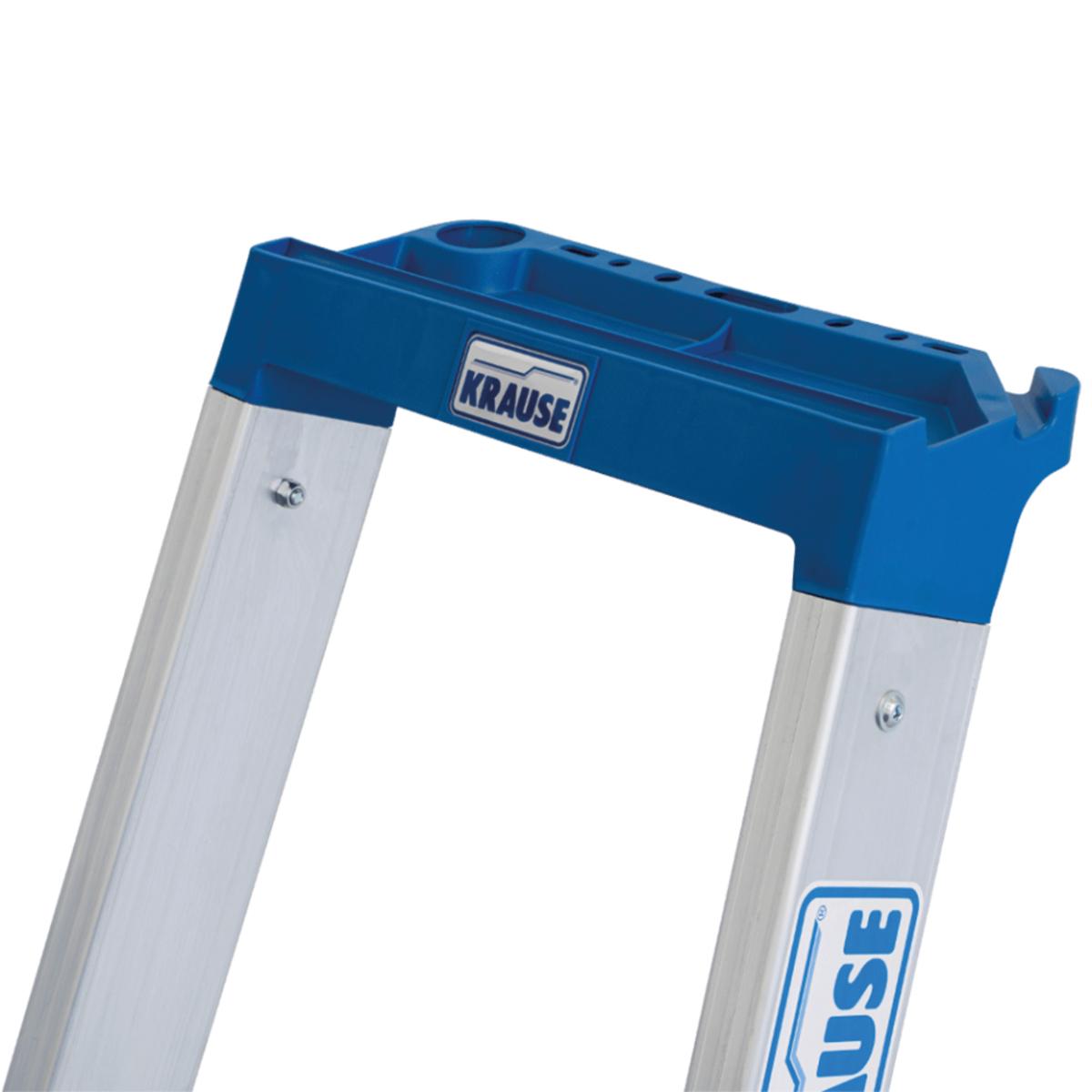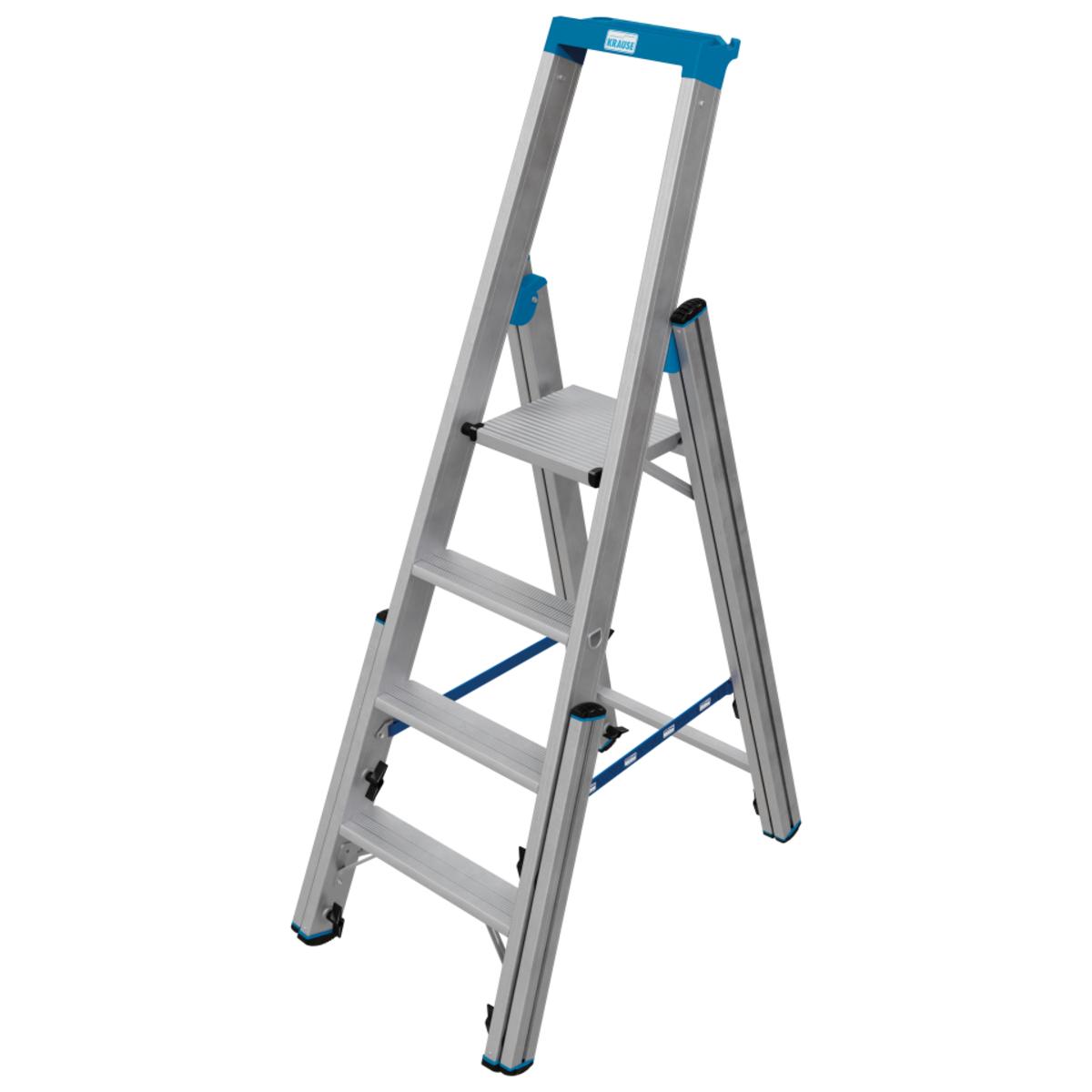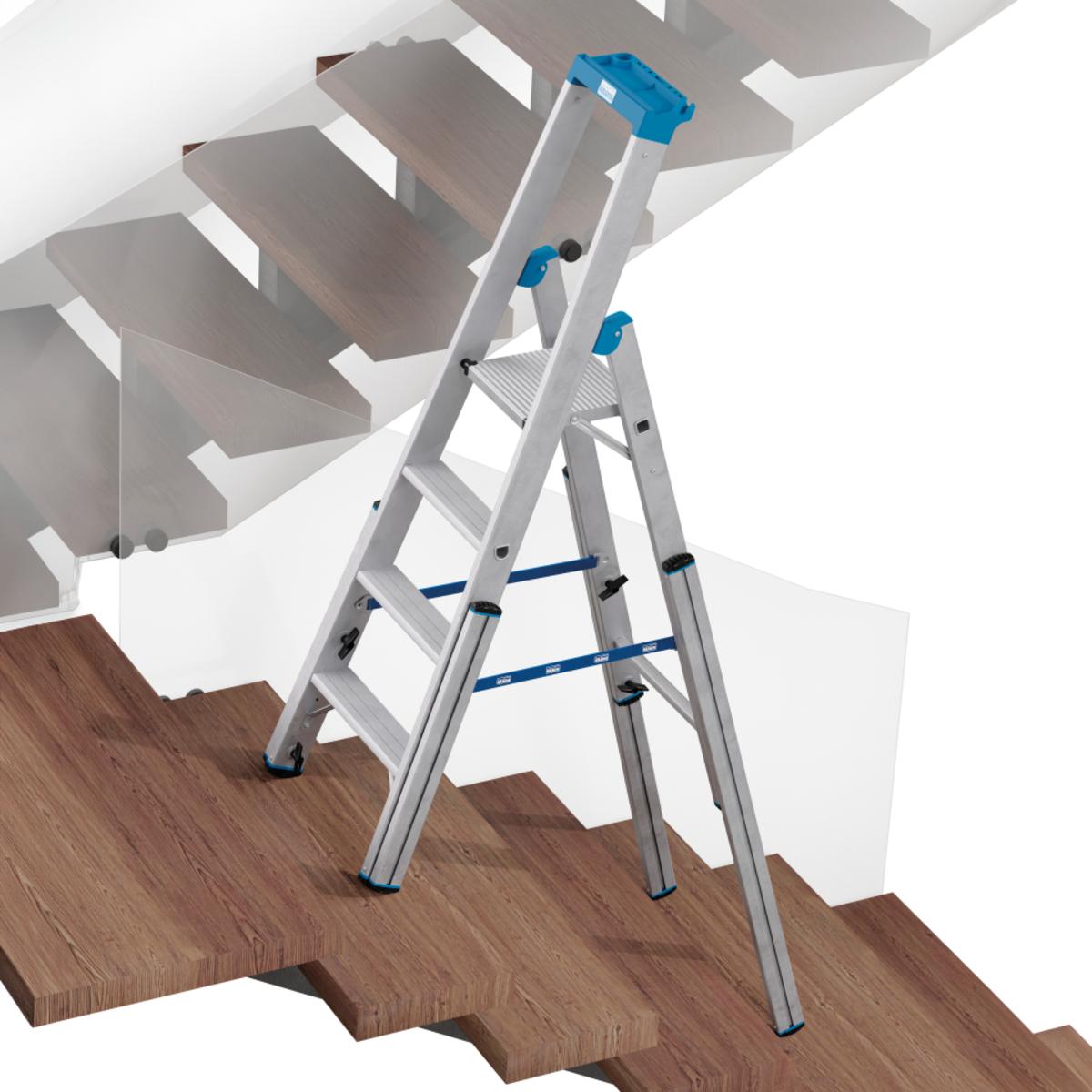 Robuste, einseitig begehbare Leiter mit hohem Sicherheitsbügel und praktischer Ablageschale. Stabile Metall-Gelenkverbindung mit Klemmschutz, große rutschhemmende Plattform und vier flexibel verstellbare Holmverlängerungen für sicheren Stand. Premium-D-Stufen und hochwertige Verarbeitung sorgen für langlebige Profi-Qualität.