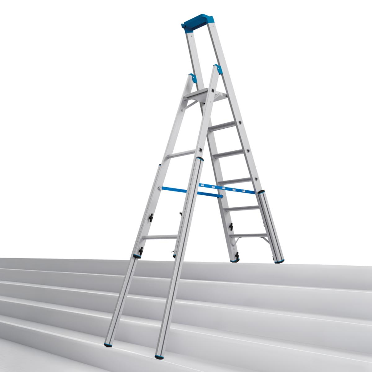 hochfest verbördelte Stufen-/Holmverbindung, Profilierte/geriffelte Stufen/Sprossen, SafetyCap Fußstopfen für sicheren Stand, Sicherheitsbügel, stabile Sicherheitsplattform, vier stufenlos verstellbare Holmverlängerungen
