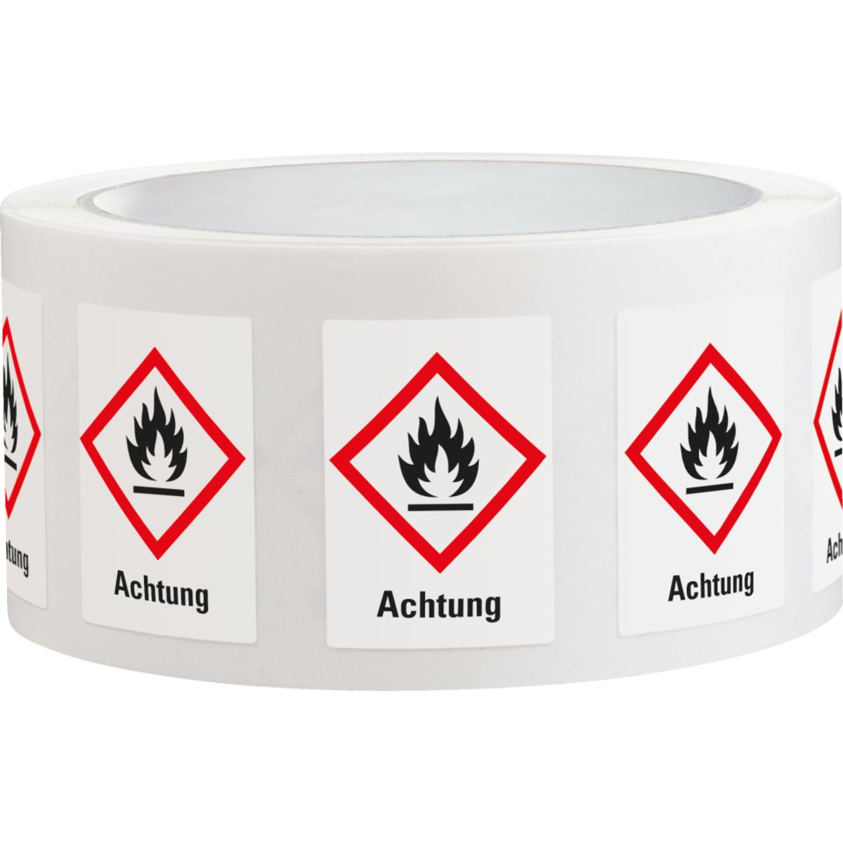 Auswahl: Gefahrensymbol Flamme GHS02, Achtung, Folie, 26x37mm, 500/Rolle