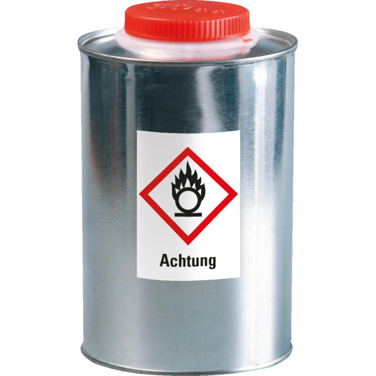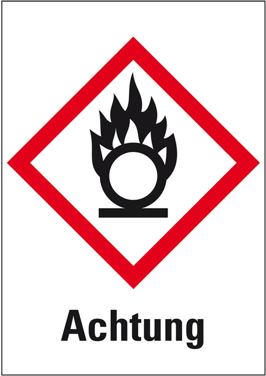 Gefahrensymbol "Flamme über Kreis GHS03 - Achtung" für die Kennzeichnung entzündend (oxidierend) wirkender Stoffe. Piktogramm und Signalwort.