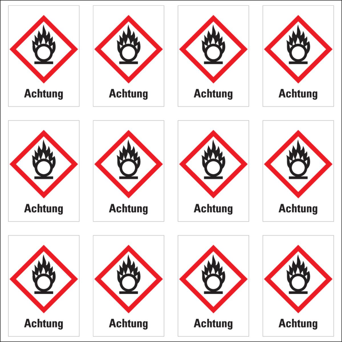Auswahl: Gefahrensymbol Flamme über Kreis GHS03, Achtung, Folie, 26x37mm, 12/Bogen