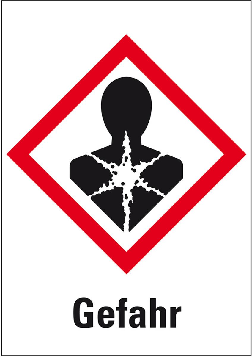 Gefahrensymbol "Gesundheitsgefahr GHS08 - Gefahr" zur Kennzeichnung bei schwerwiegender Aspirationsgefahr, Sensibilisierung der Atemwege, sowie bei mutagenen, reproduktionstoxischen und krebserzeugenden Stoffen. Piktogramm und Signalwort.
