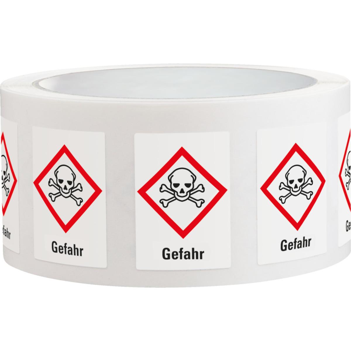 Auswahl: Gefahrensymbol Totenkopf m.gekr.Knochen, GHS06, Gefahr, Folie, 26x37mm, 500/Rolle