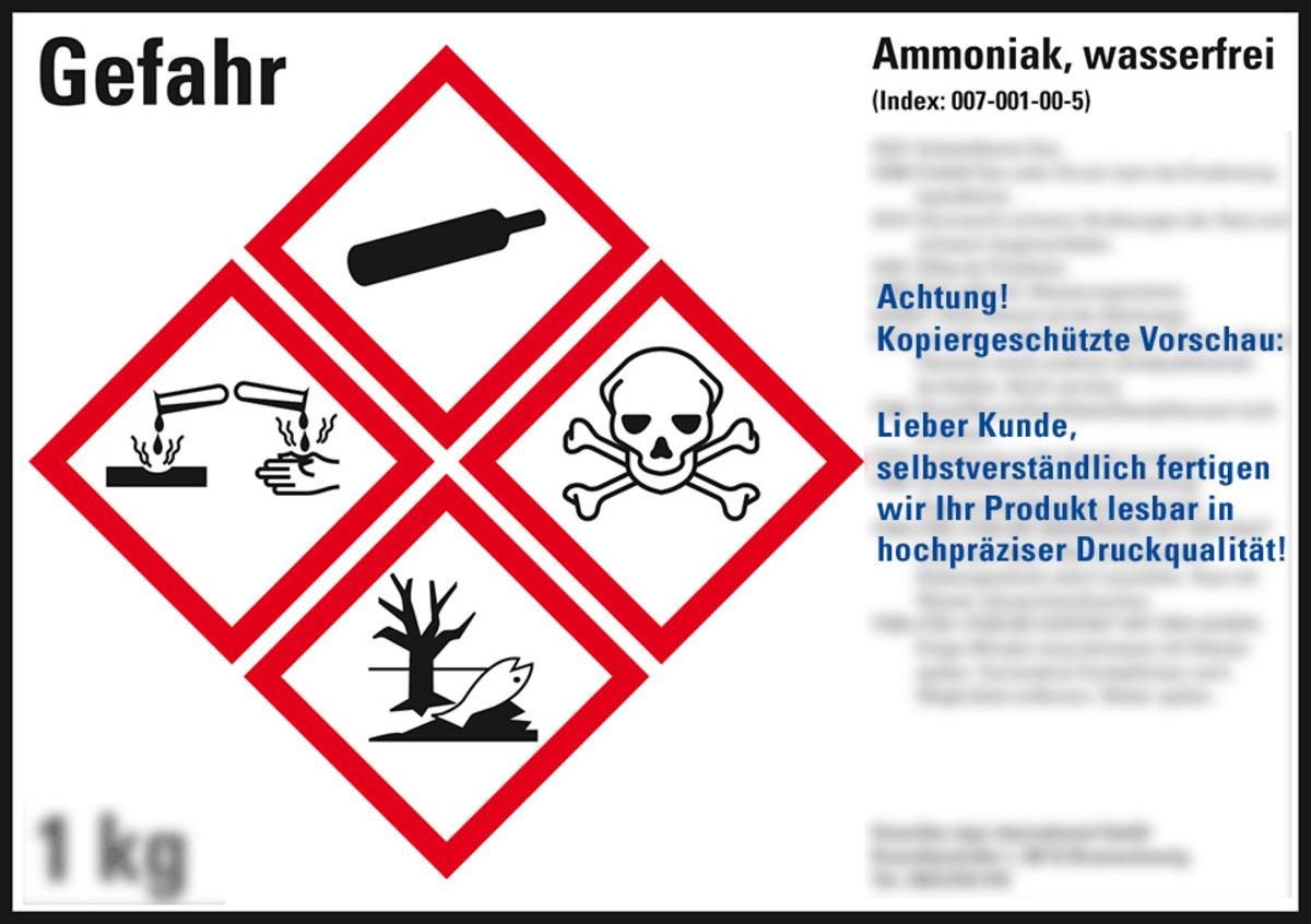 Auswahl: Gefahrstoffetikett Ammoniak, wasserfrei, nach Wunsch, GefStoffV/GHS/CLP, 105x74mm, 8/Bogen