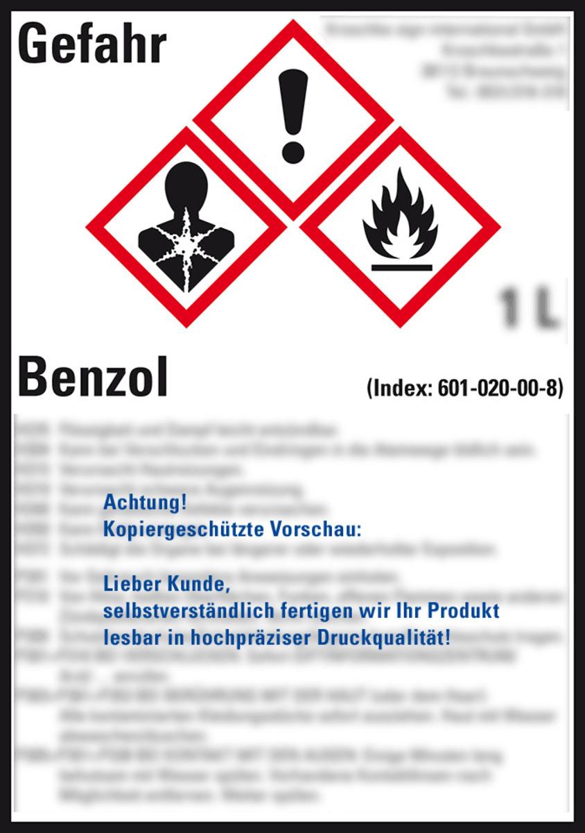 Auswahl: Gefahrstoffetikett Benzol, nach Wunsch, GefStoffV/GHS/CLP, Folie, 52x74mm, 10/Bogen