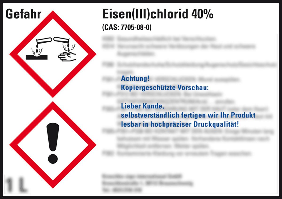Auswahl: Gefahrstoffetikett Eisen(III)chlorid 40%, nach Wunsch, GefStoffV/GHS/CLP, 148x105mm, 4/Bogen