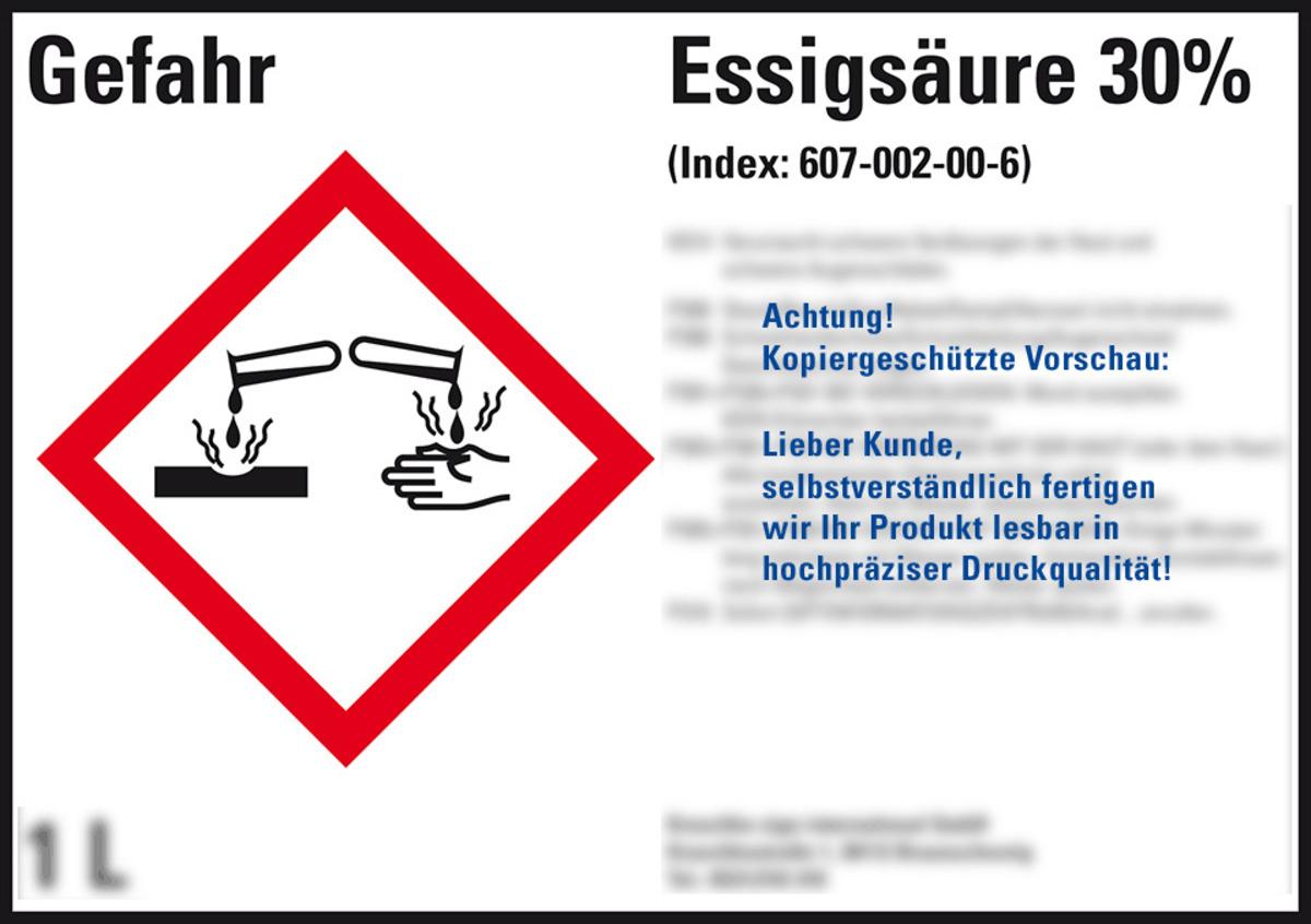 Auswahl: Gefahrstoffetikett Essigsäure 30%, nach Wunsch, GefStoffV/GHS/CLP, Folie, 105x74mm, 8/Bogen