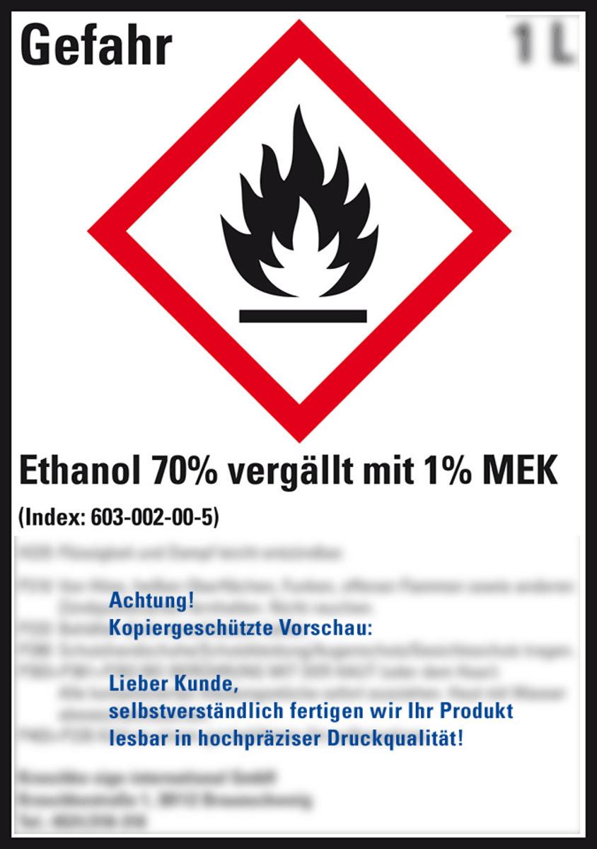 Auswahl: Gefahrstoffetikett Ethanol 70%, 1%MEK, nach Wunsch, GefStoffV/GHS/CLP, Folie, 52x74mm, 10/Bogen