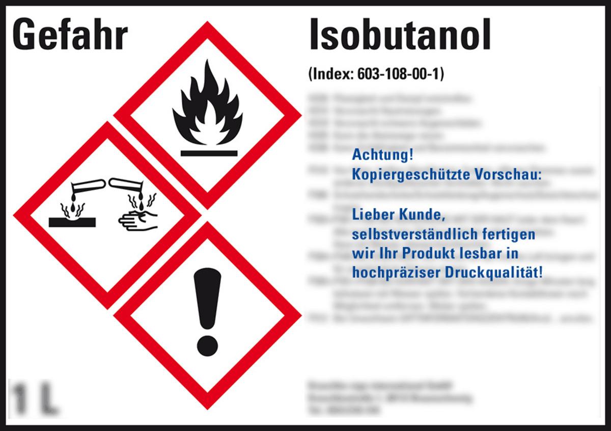 Auswahl: Gefahrstoffetikett Isobutanol, nach Wunsch, GefStoffV/GHS/CLP, Folie, 105x74mm, 8/Bogen