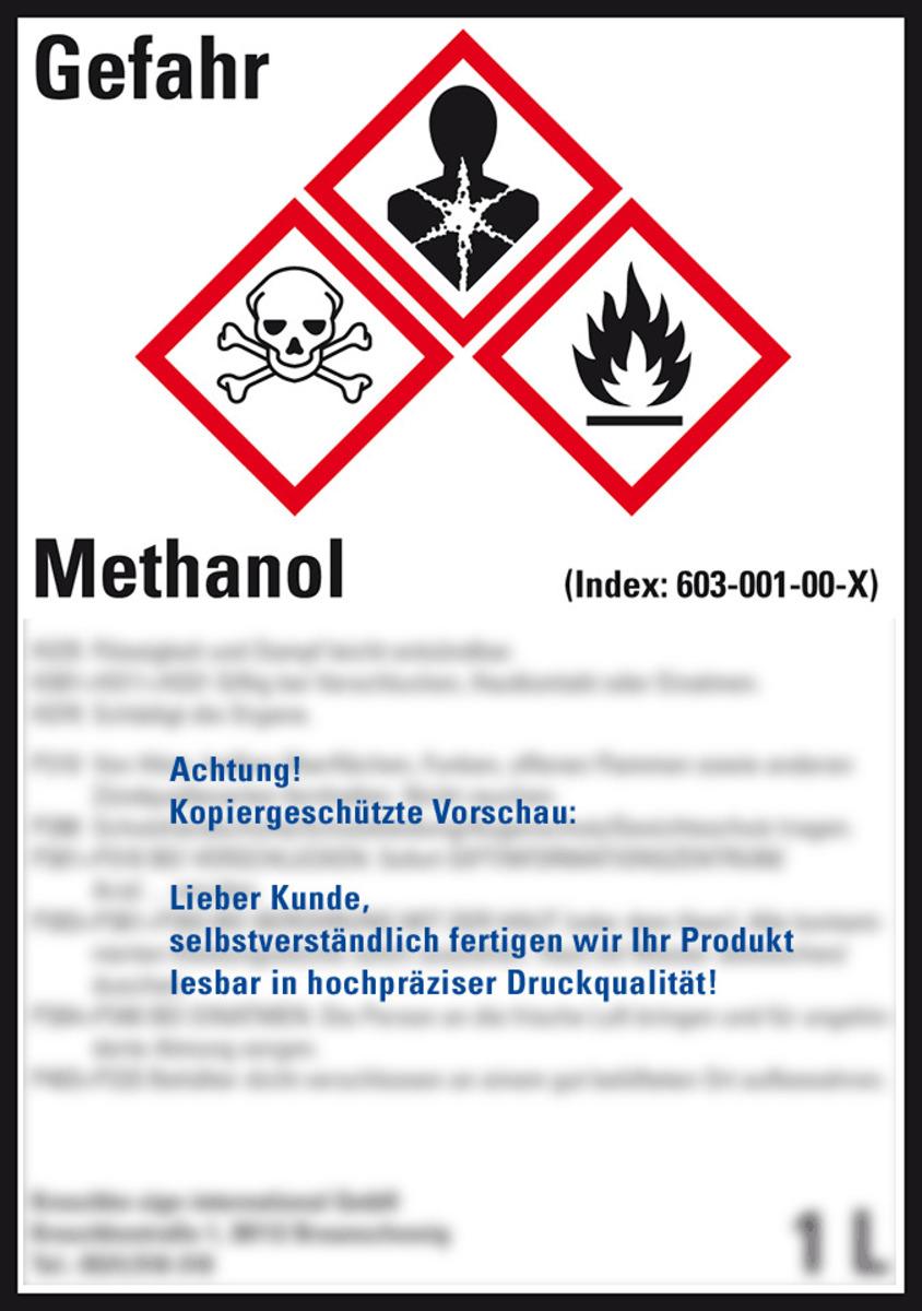 Auswahl: Gefahrstoffetikett Methanol, nach Wunsch, GefStoffV/GHS/CLP, Folie, 52x74mm, 10/Bogen