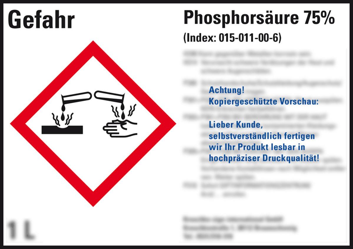 Auswahl: Gefahrstoffetikett Phosphorsäure 75%, nach Wunsch, GefStoffV/GHS/CLP, Folie, 105x74mm, 8/Bogen