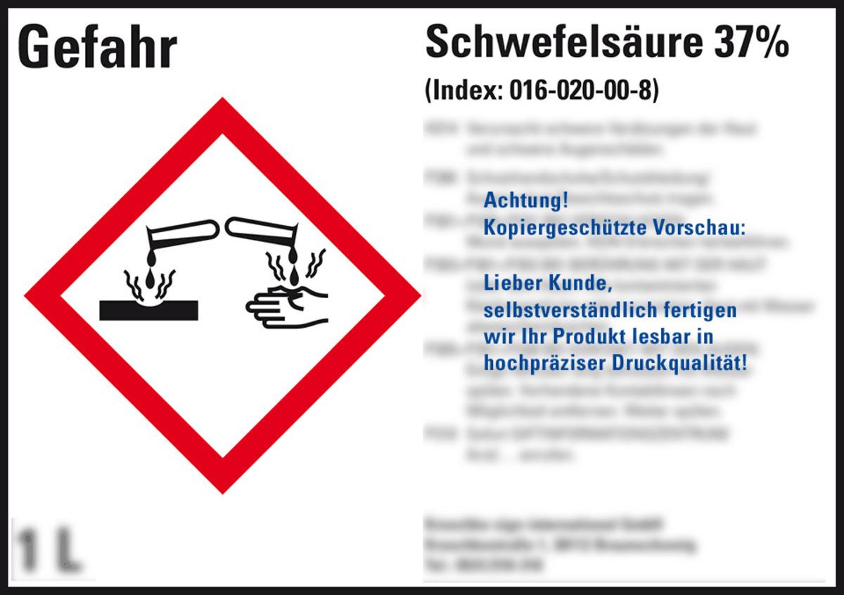 Auswahl: Gefahrstoffetikett Schwefelsäure37%, nach Wunsch, GefStoffV/GHS/CLP, Folie, 148x105mm, 4/Bogen