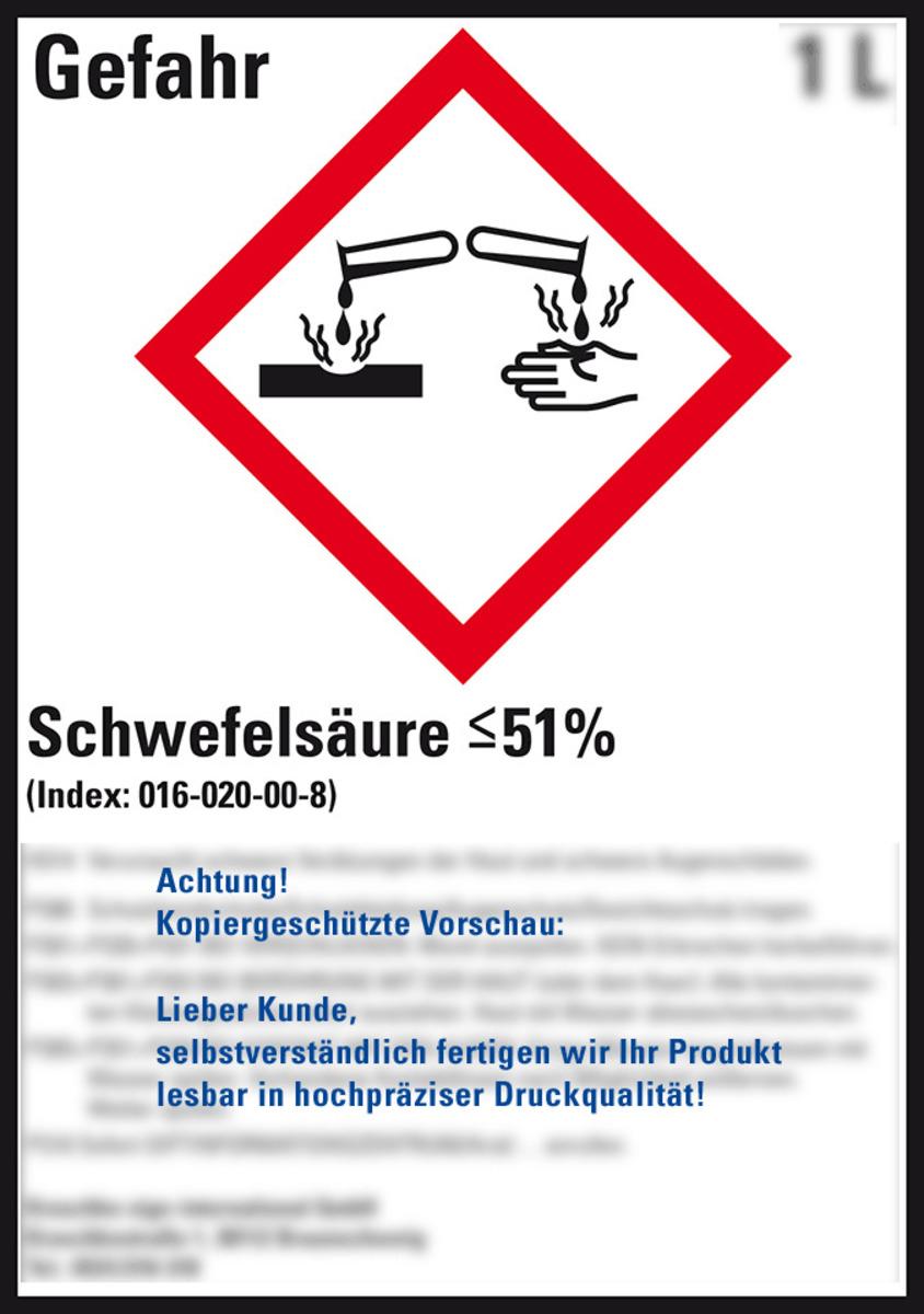Auswahl: Gefahrstoffetikett Schwefelsäure <=51%, nach Wunsch, GefStoffV/GHS/CLP, 52x74mm, 10/Bogen