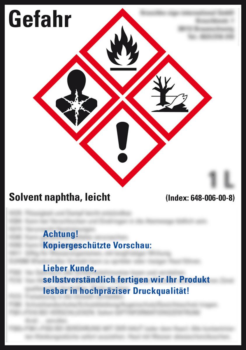 Auswahl: Gefahrstoffetikett Solvent naphtha leicht, nach Wunsch, GefStoffV/GHS/CLP, 52x74mm, 10/Bogen