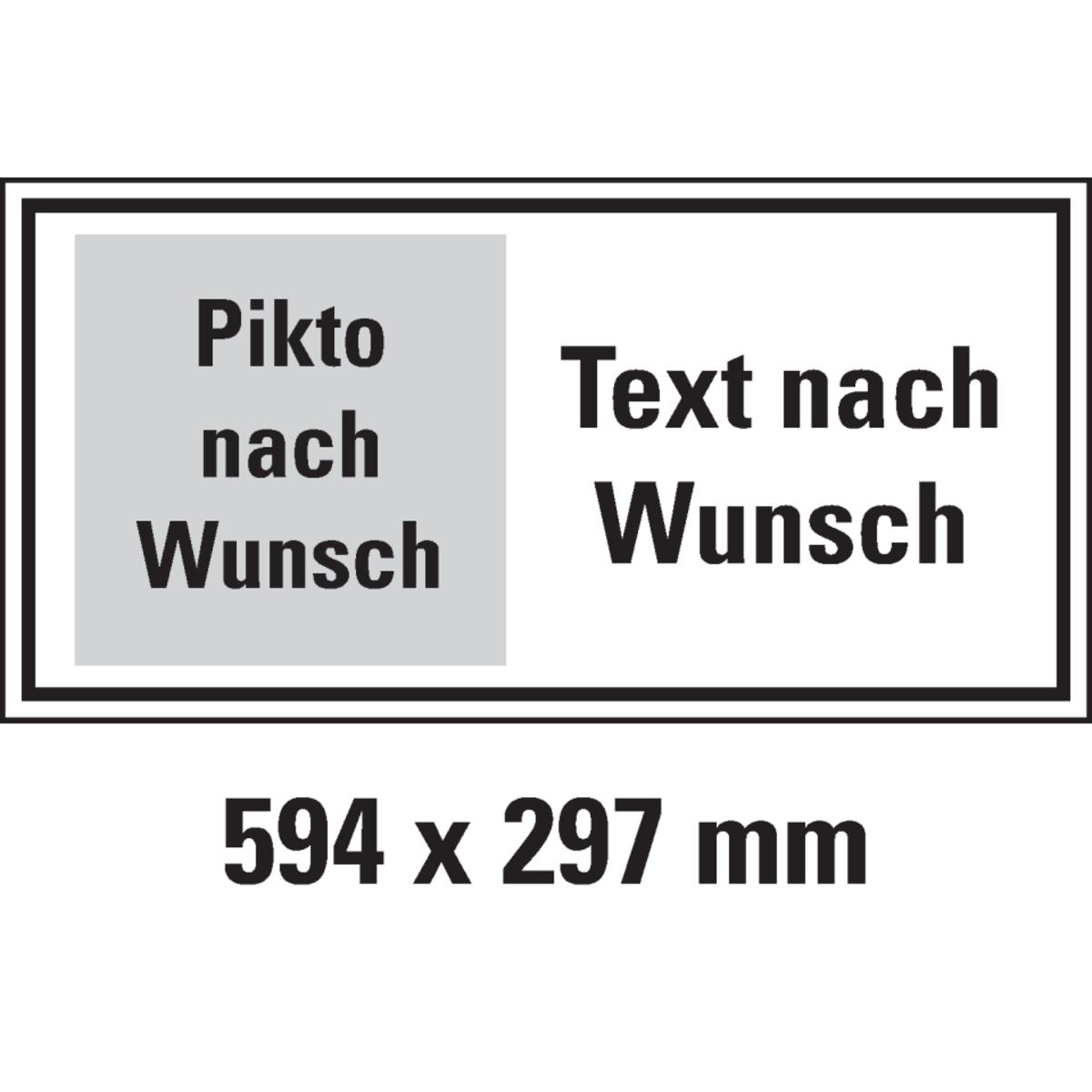 Auswahl: Hinweisschild, 1 Pikto KennV/ÖNORM/ISO links/Text nach Wunsch. rechts, Aluminium, 594x297mm
