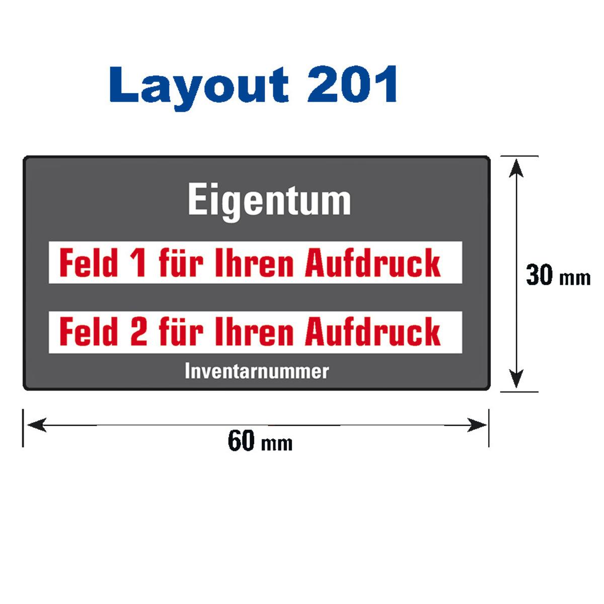 Auswahl: Inventaretikett Eigentum, 2 Felder Text nach Wunsch, Dokumentenfolie, 60x30mm, 9/Bogen