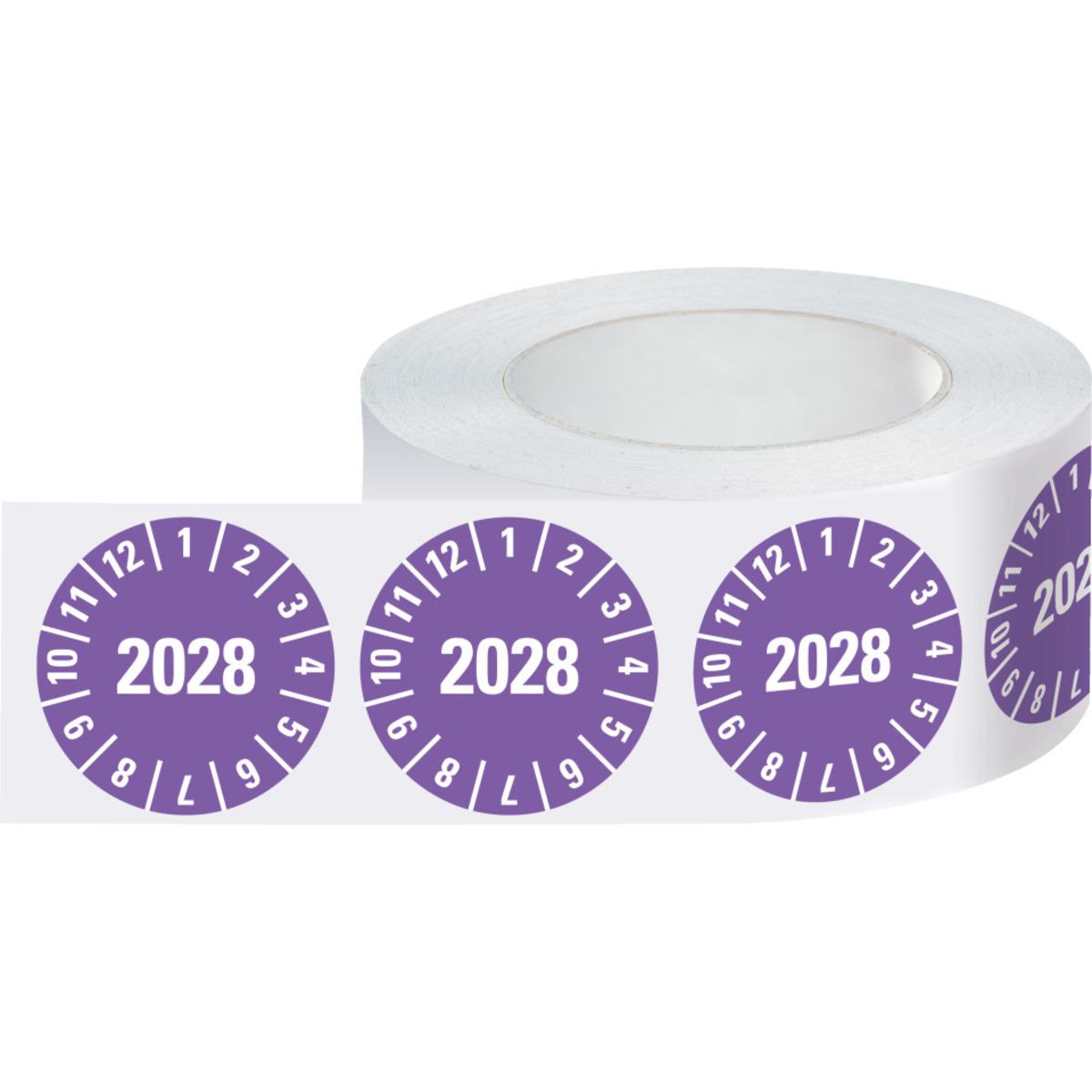 Auswahl: Prüfplakette 2028, violett, Folie, ablösbar, Ø 15mm, 1000/Rolle