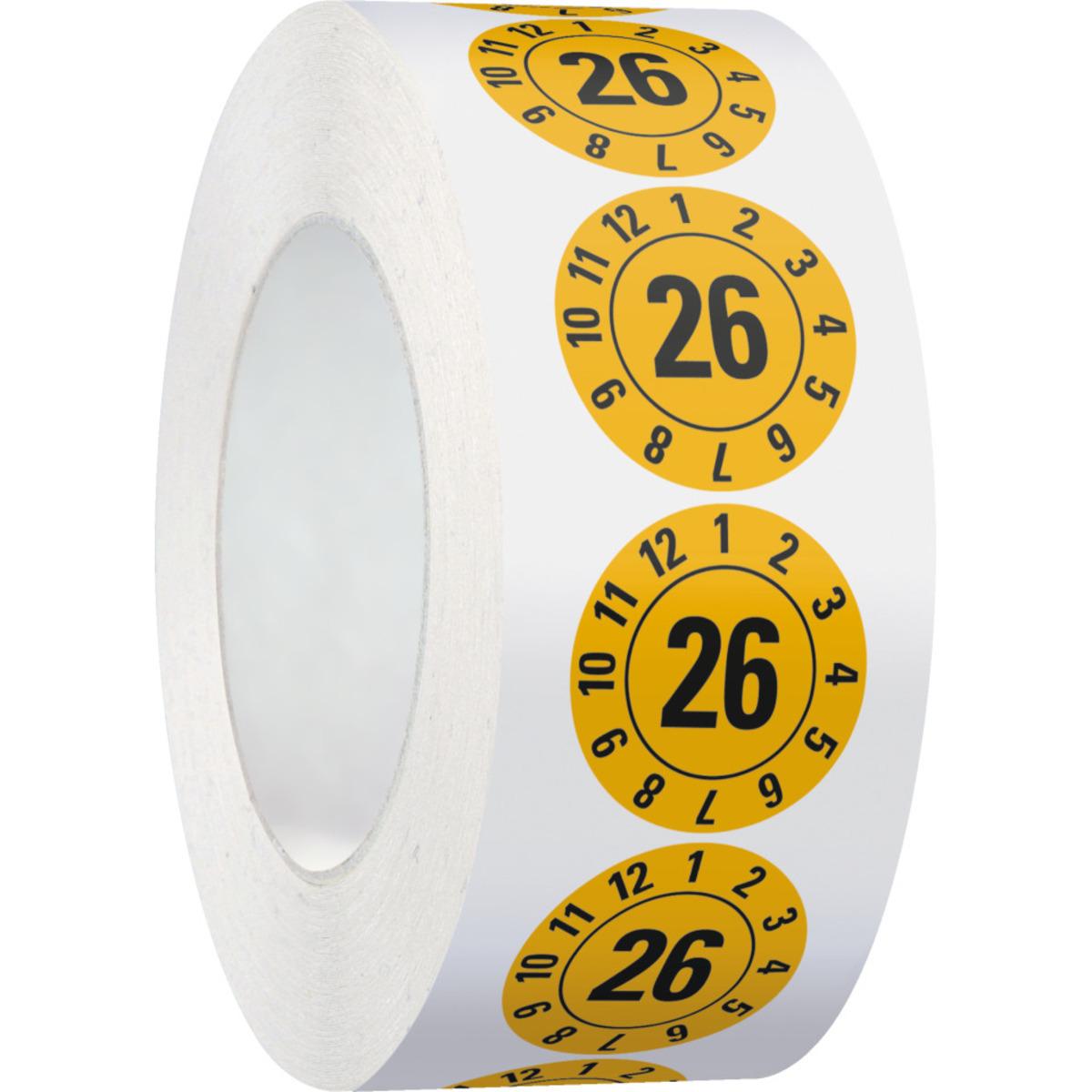 Auswahl: Jahresprüfplakette 26, gelb, Dokumentenfolie, Ø 20mm, 500/Rolle