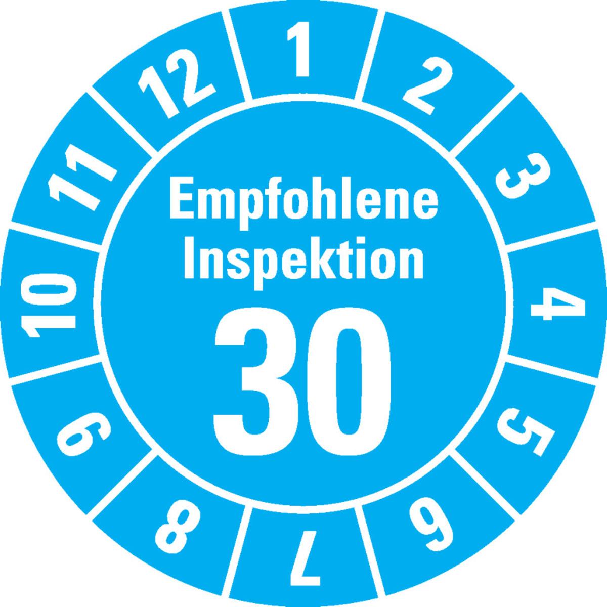 An Maschinen und Geräten sollten regelmäßig Inspektionen durchgeführt werden. Mit der Jahresprüfplakette "Empfohlene Inspektion" regeln Sie die Einhaltung der Überprüfungszyklen und damit die korrekte Funktionsweise der Maschine/des Geräts.