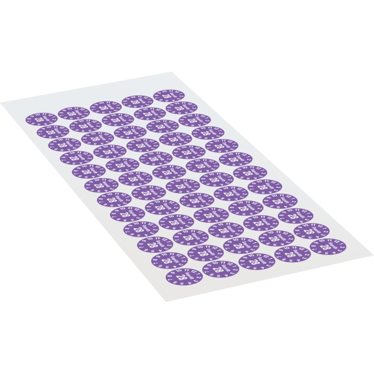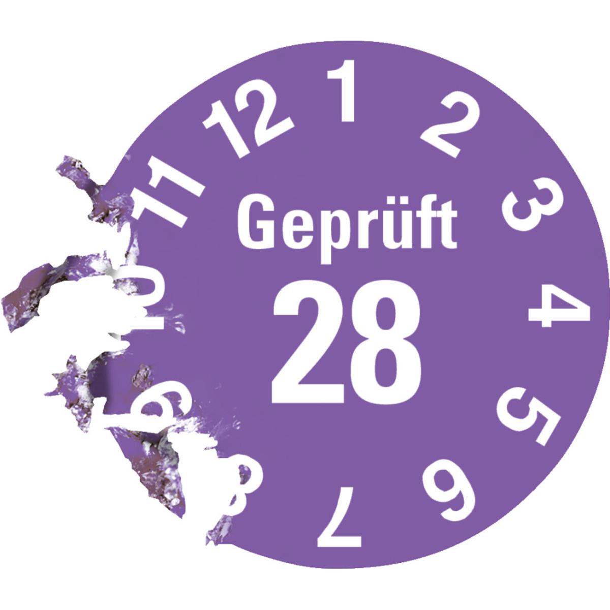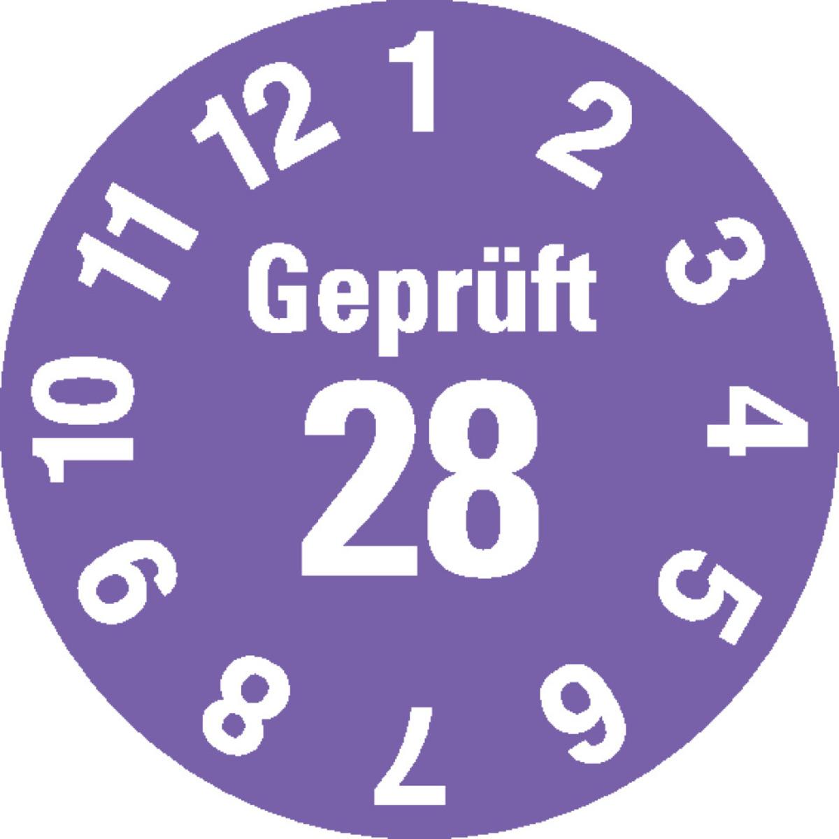 Auswahl: Prüfplakette Geprüft 28, violett, Dokumentenfolie, selbstklebend, Ø 15mm, 60/Bogen