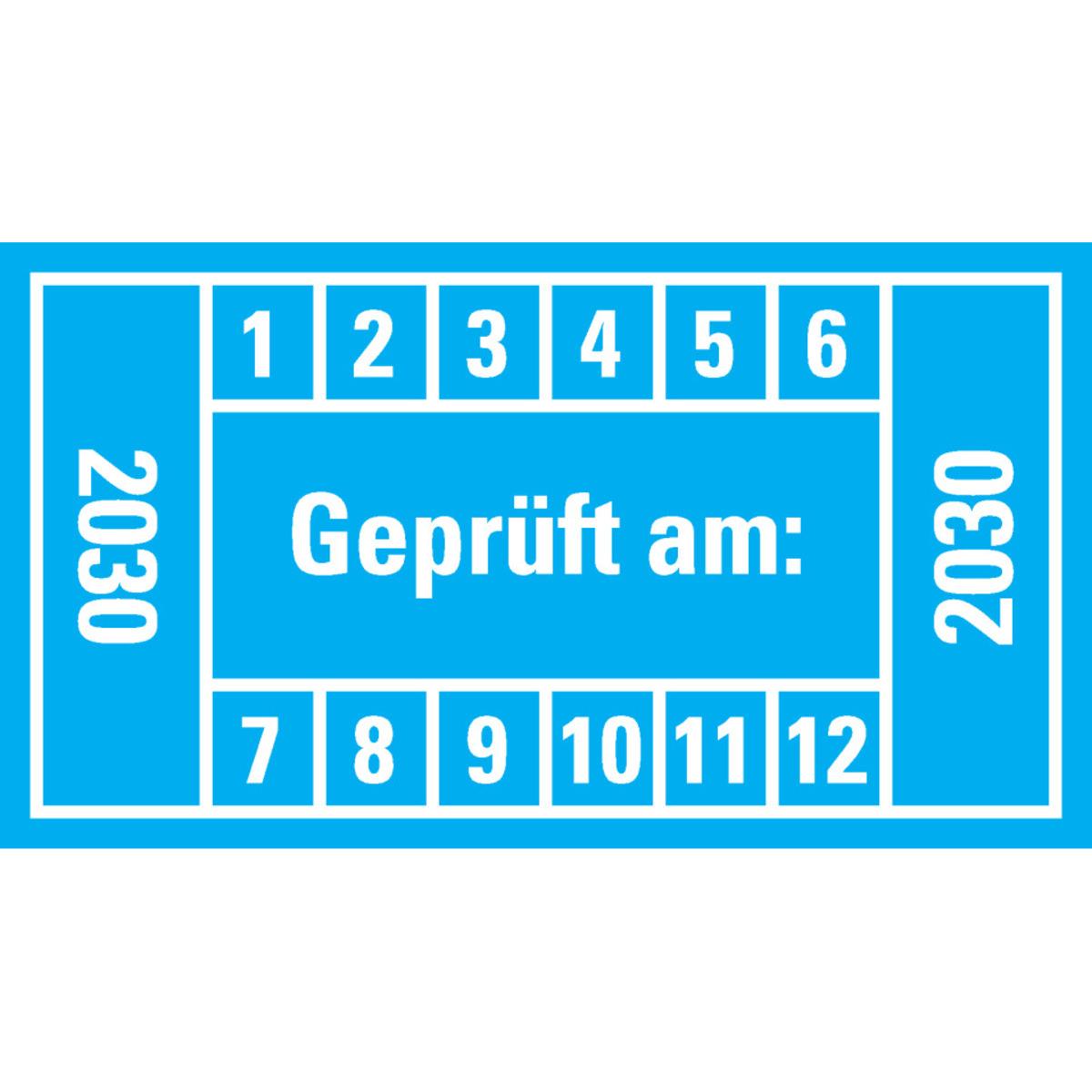 Eckige Jahresprüfplakette mit dem Text "Geprüft am:".