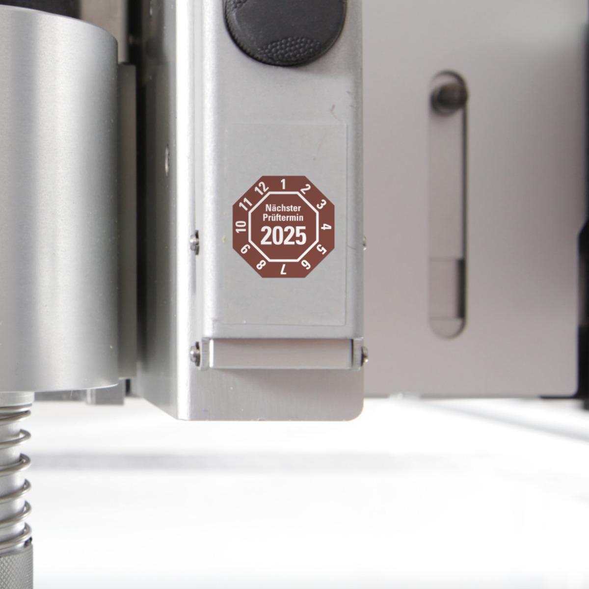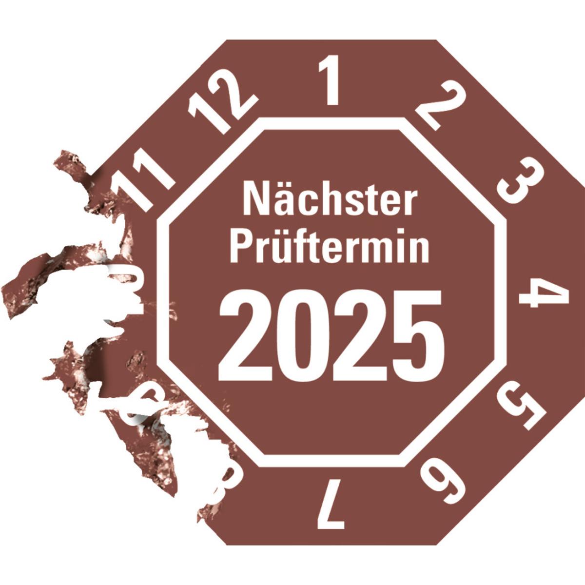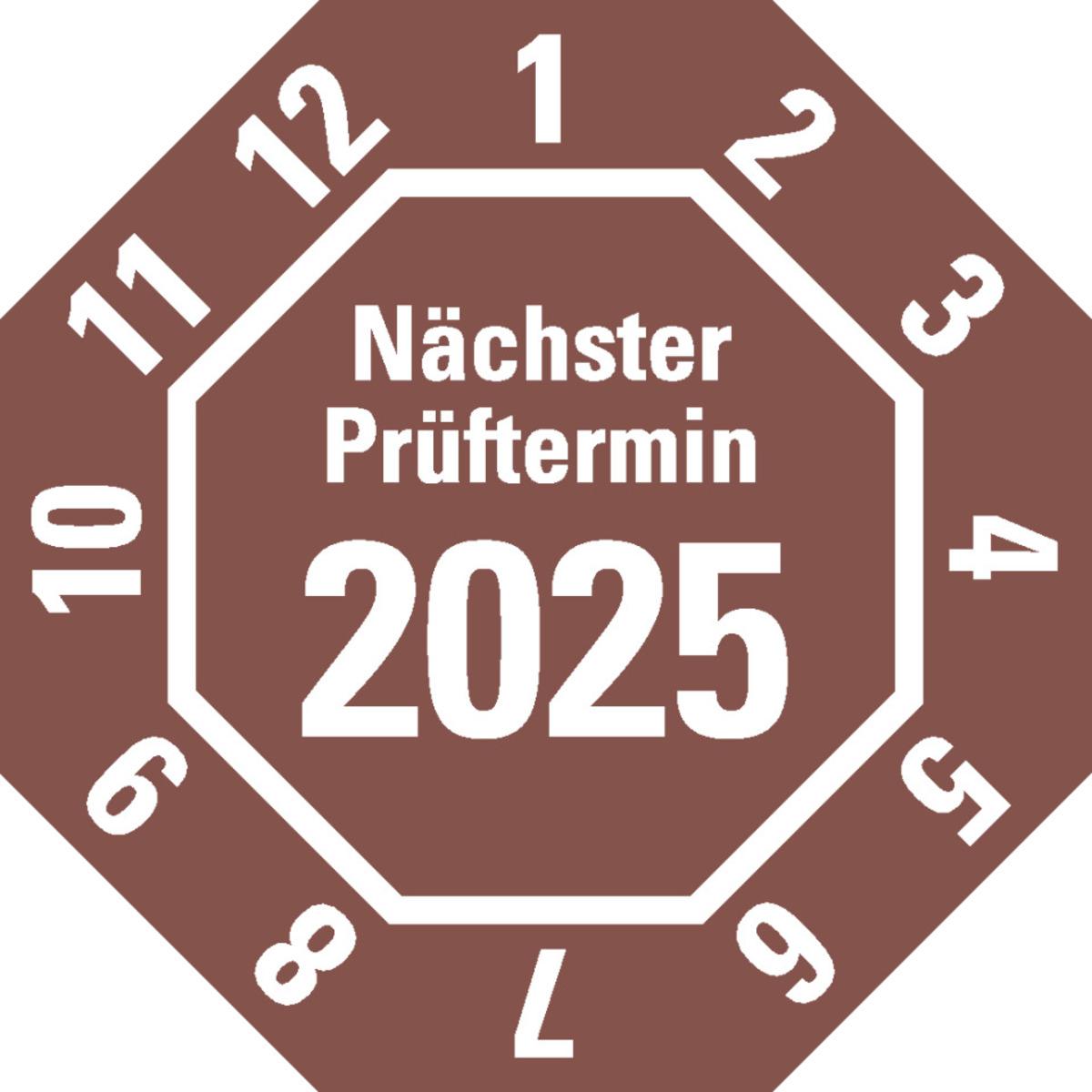 Auswahl: Prüfplakette Nä.Prüftermin 2025, 8-eckig, braun, Dokufolie, 30x30mm, 18/Bogen