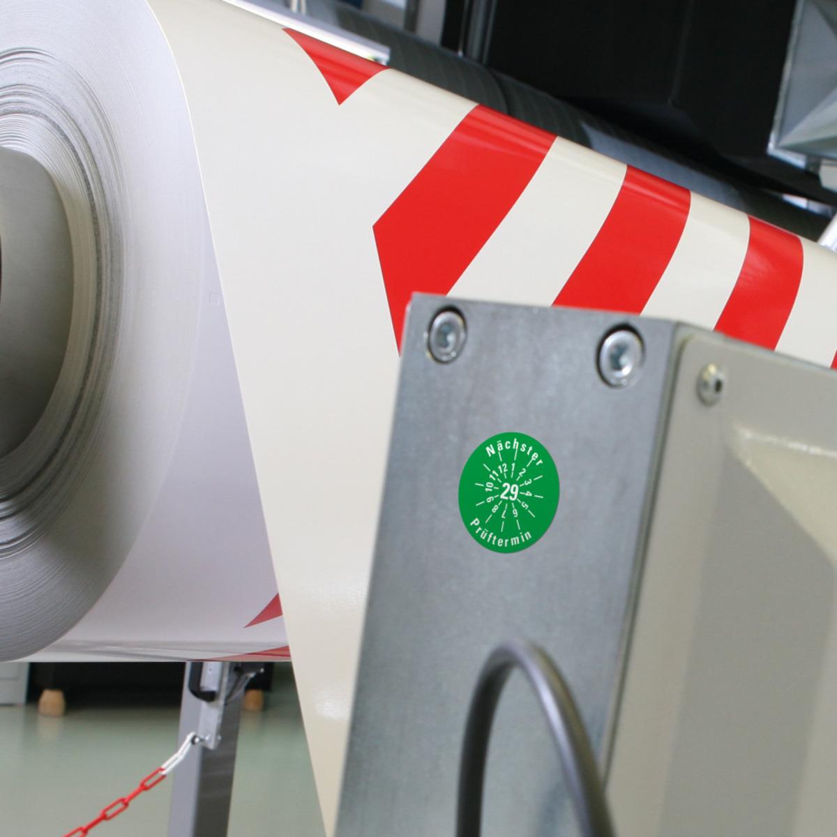 Mit der Jahresprüfplakette "Nächster Prüftermin" als Kranztext behalten Sie Inspektionen/Wartungsstand fest im Blick und stellen die Einhaltung der Prüffristen sicher.