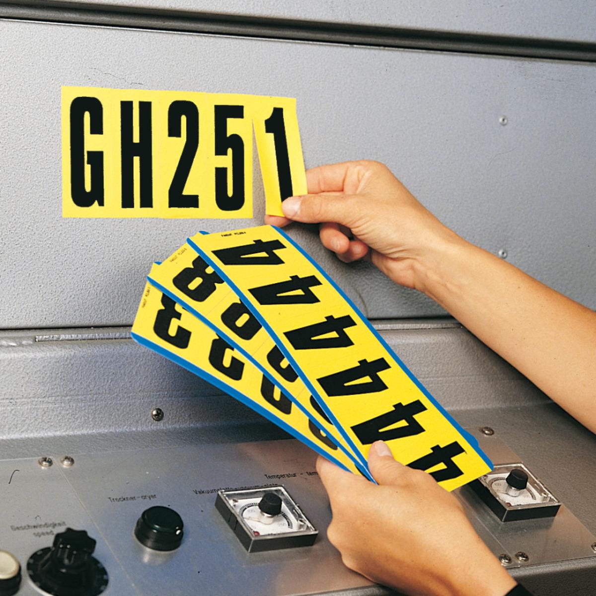 Selbstklebende Ziffern und Buchstaben zur freien Kennzeichnung von Gegenständen oder Orten wie Ordnern, Arbeitsmaterialien, Lagerplätzen, Regalen, Kisten, Geräten und Maschinen.