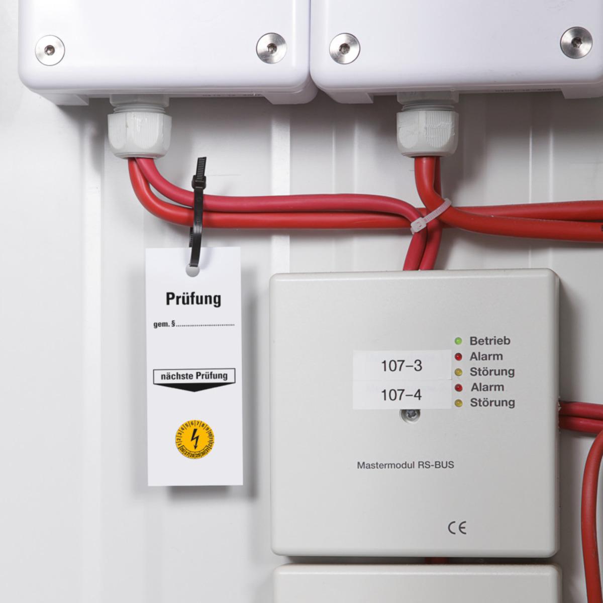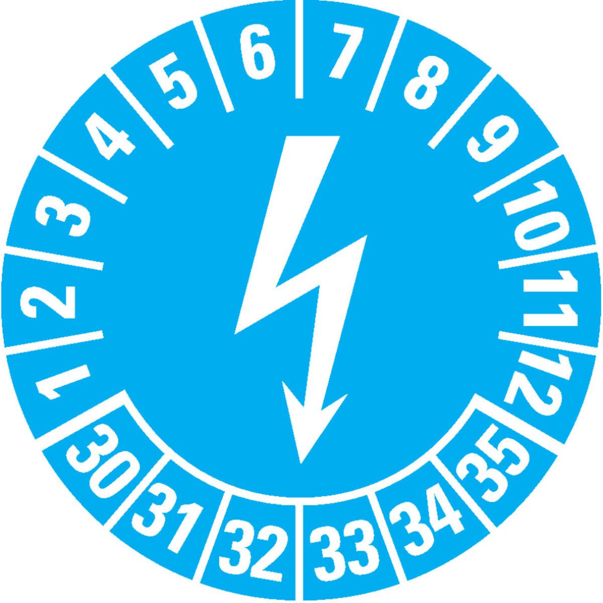 Mehrjahresprüfplakette mit Blitzpfeil für die Prüfung von elektrischen Arbeitsmitteln.