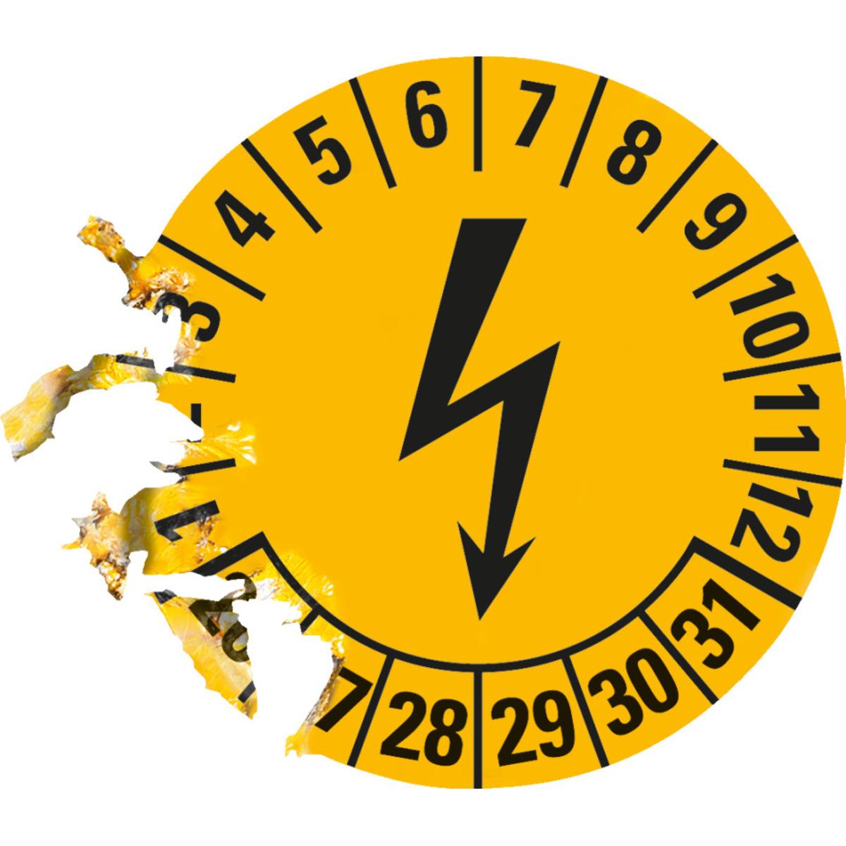 Auswahl: Prüfplakette Blitzpfeil 26-31, gelb, Dokumentenfolie, selbstkl., Ø 25mm, 21/Bogen