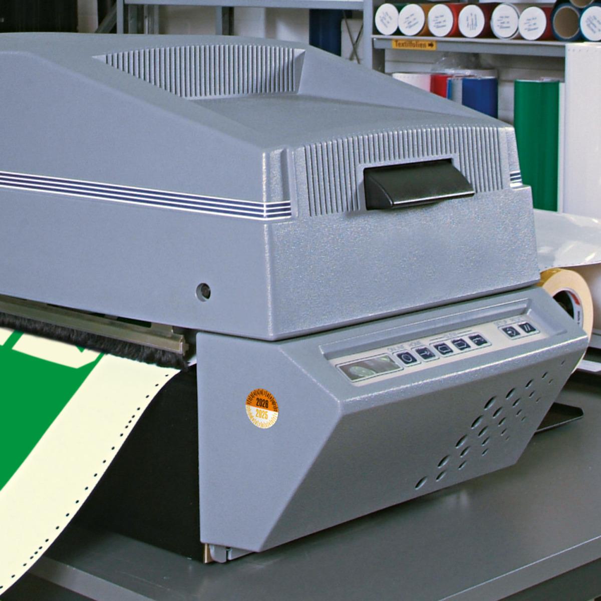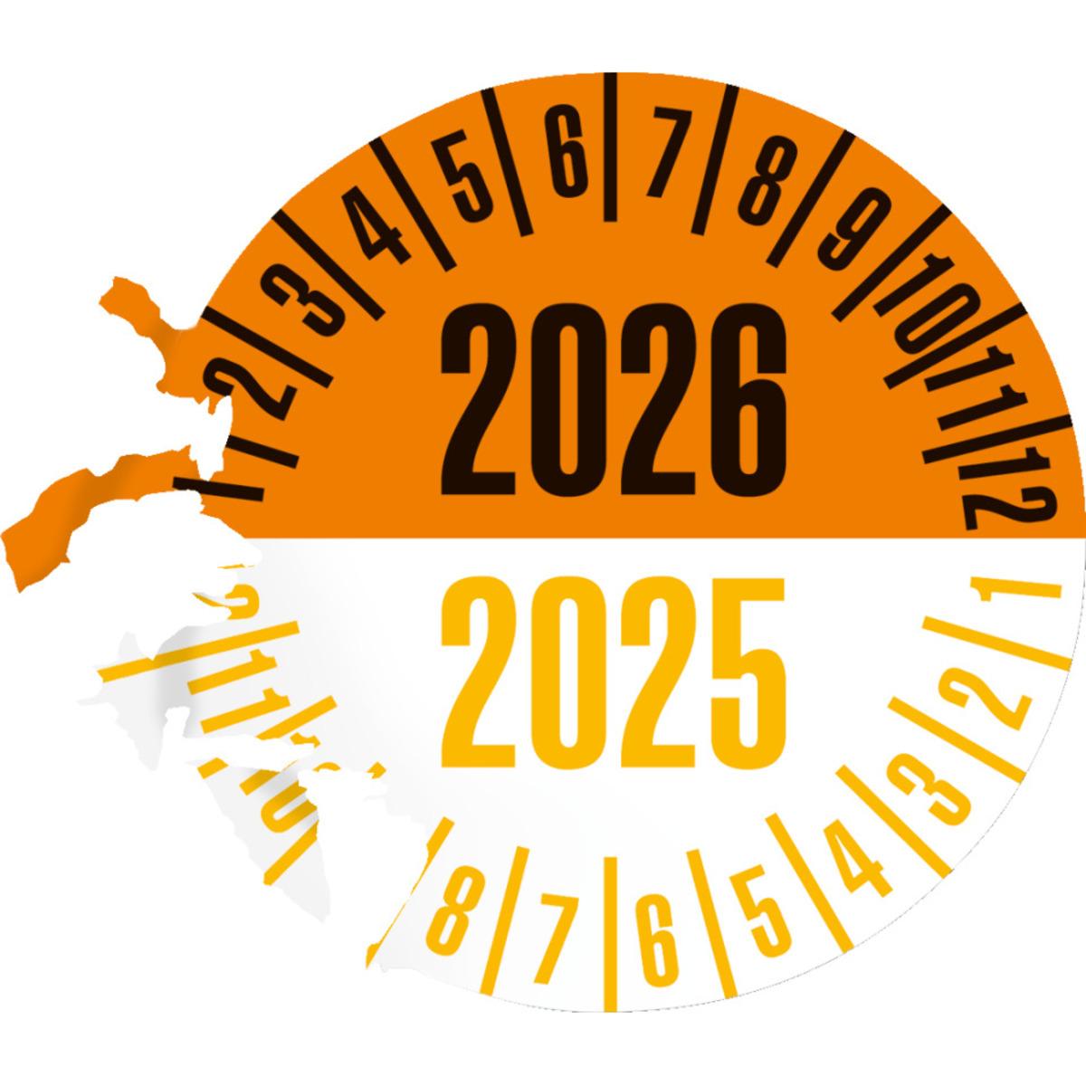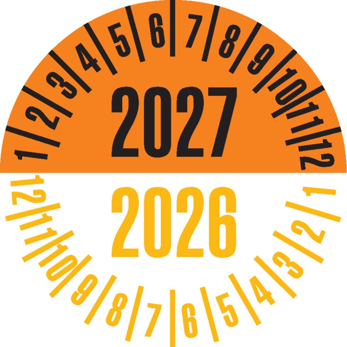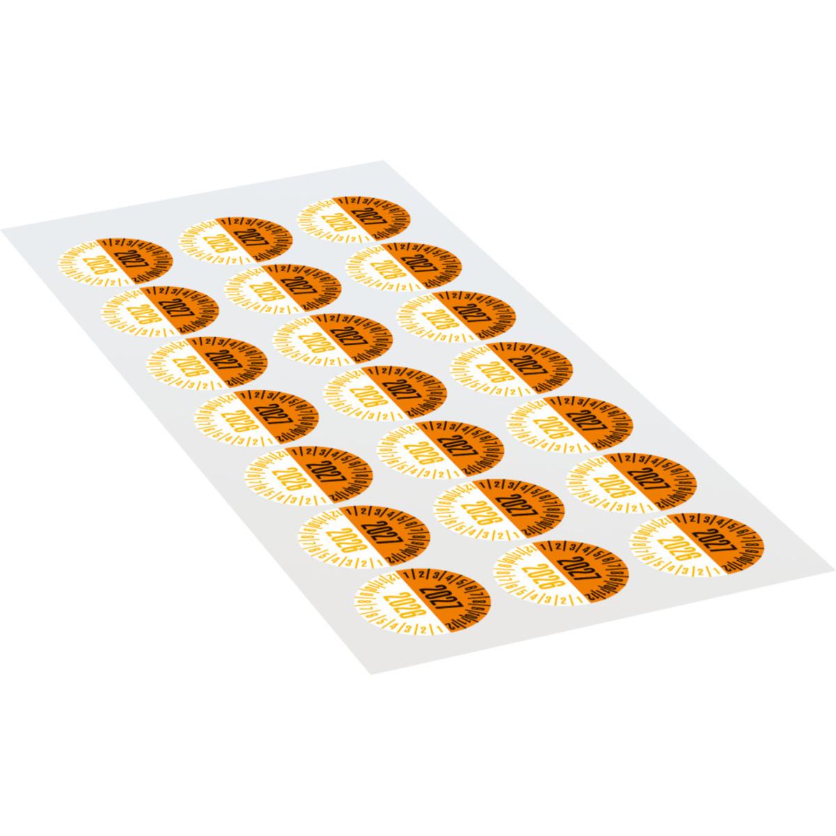 Auswahl: Prüfplakette 2027/2026, orange/gelb, Dokumentenfolie, Ø 25mm, 21/Bogen