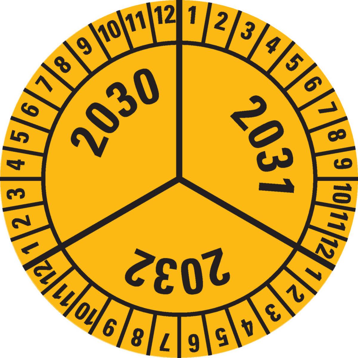 Auswahl: Prüfplakette 2025-2027, gelb, Dokumentenfolie, selbstklebend, Ø 40mm, 10/Bogen
