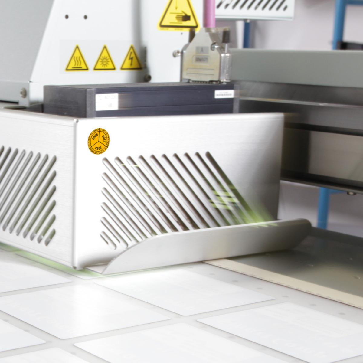 Die Mehrjahresprüfplakette mit den jeweiligen Monaten der Jahre im Außenkranz erleichtert die Terminkontrolle gesetzlich vorgeschriebener Geräteprüfungen und zeigt den aktuellen Wartungsstand zuverlässig an. Durch die abgebildete Zeitspanne können auch längere Prüffristen in jedem der Jahre monatsgenau erfasst werden.