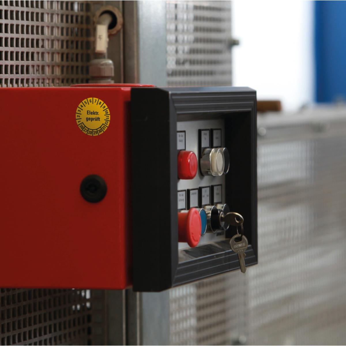 Die Mehrjahresprüfplakette "Elektr. geprüft" mit Oberflächenschutz erleichtert die Terminkontrolle gesetzlich vorgeschriebener Geräteprüfungen und zeigt den aktuellen Wartungsstand zuverlässig an. Durch die abgebildete Zeitspanne können auch längere Prüffristen problemlos erfasst werden.