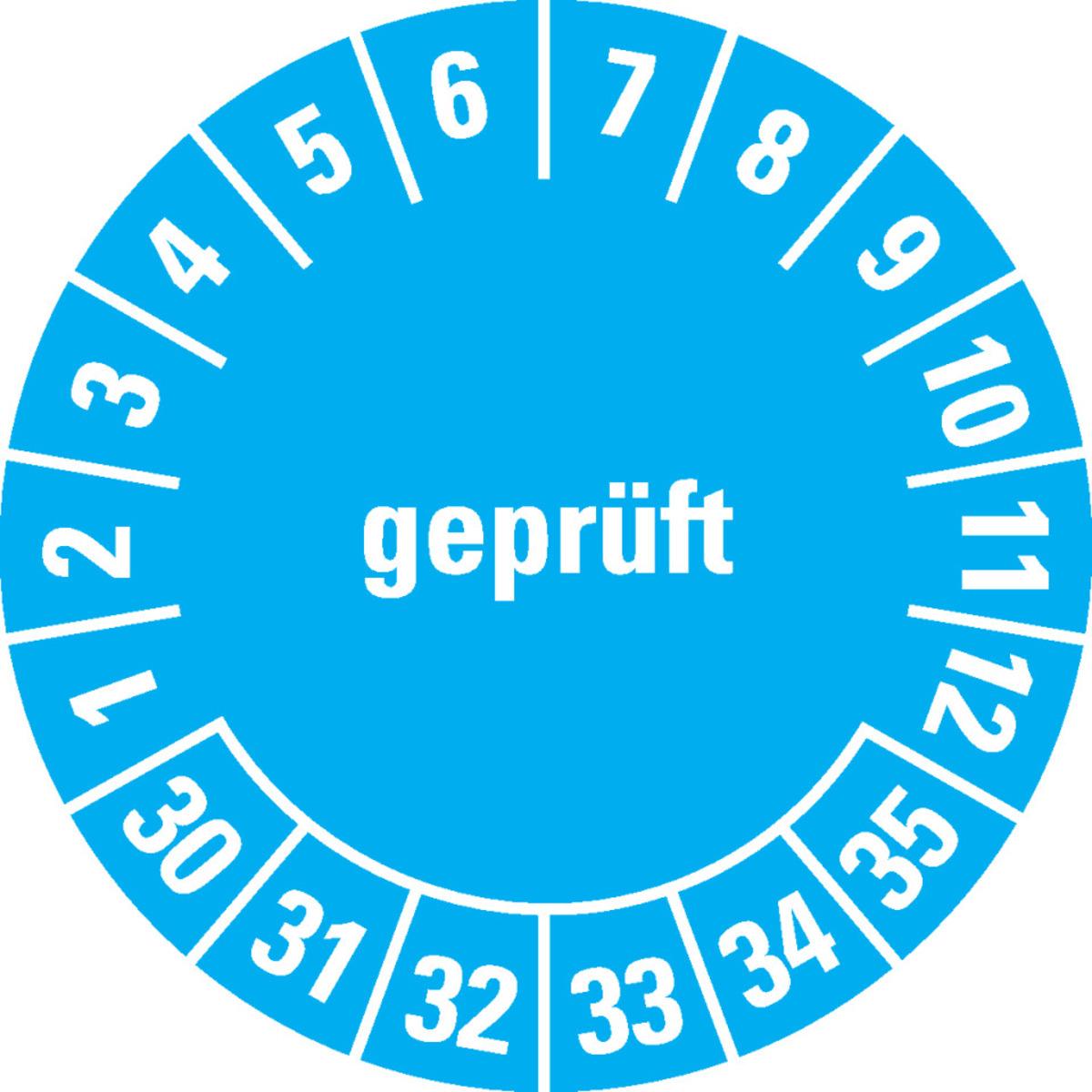 Die Mehrjahresprüfplakette "Geprüft" erleichtert die Terminkontrolle gesetzlich vorgeschriebener Geräteprüfungen und zeigt den aktuellen Wartungsstand zuverlässig an. Durch die abgebildete Zeitspanne können auch längere Prüffristen problemlos erfasst werden.
