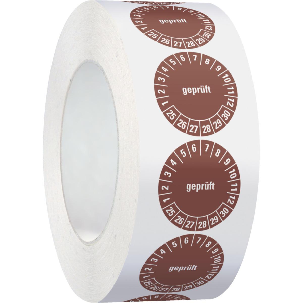 Auswahl: Prüfplakette geprüft 25-30, braun/weiß, Dokufolie, selbstkl., Ø30mm, 500/Rolle